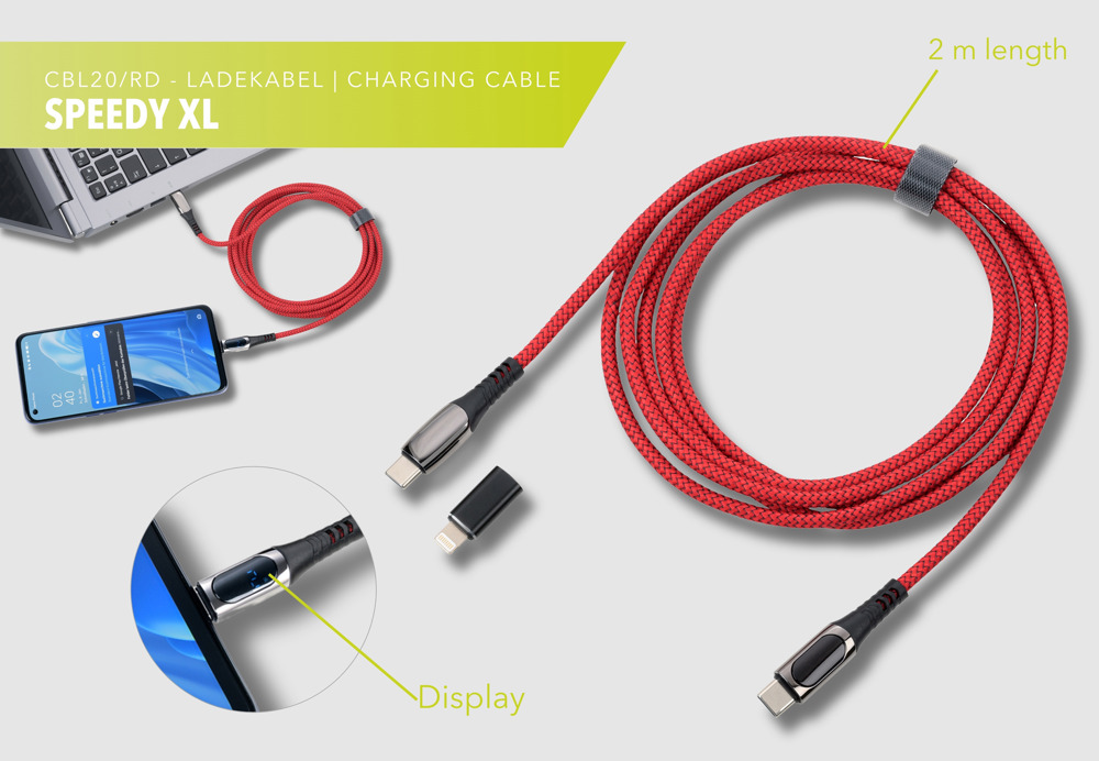 Charging cable high-speed USB-C 100W PD Power Delivery to USB-C, with data transfer function, full charging capacity: max. 100W|20V|5A (without adapter), depending on the device to be charged, with digital display of the charging power, incl. USB-C to Lightning adapter, textile-braided cable (mesh structure), recycled polyester, 2m length, metal, polyester, black/gunmetal