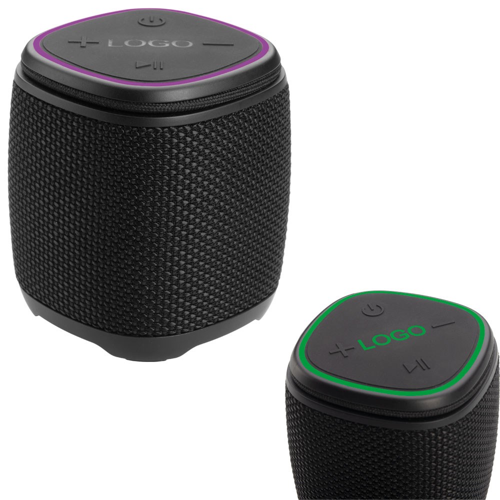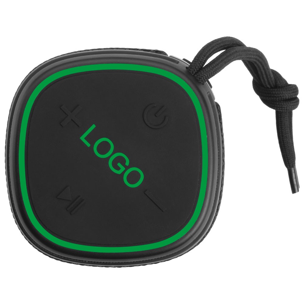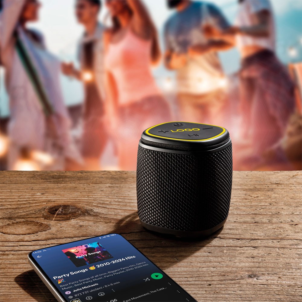 Der kabellose, leichte, wasserfeste Außenlautsprecher mit Handschlaufe von Schwarzwolf outdoor ist in der Farbe schwarz erhältlich. Er hat eine Leistung von 5 W, eine Reichweite von 20 m, Bluetooth V5.1, einen Steckplatz für eine TF-Karte, einen USB-C-Anschluss und ist mit einem weiteren Hermon Lautsprecher koppelbar um einen Stereoeffekt zu erzeugen. Er enthält einen integrierten Akku mit einer Kapazität von 500 mAh. Die Spieldauer mit einer Ladung beträgt ca. 3–4 Stunden. Die Ladezeit bis zur vollständigen Aufladung beträgt ca. 1–2 Stunden. Das lasergravierte Logo und der Rand des Bedienfelds werden durch LED-Licht in wechselnden Farben beleuchtet. Der Lautsprecher ist nach IPX5 wasserdicht. Das Ladekabel ist im Lieferumfang enthalten. Verpackt in einer Schwarzwolf outdoor Geschenkbox. Material: ABS, Gummi, Stoff, Silikon Empfohlene Veredelungstechnik: Laser L2 Maximale Veredlungsgröße: 25 x 10 mm Abmessungen: 7,2 x 8,2 x 7,2 cm