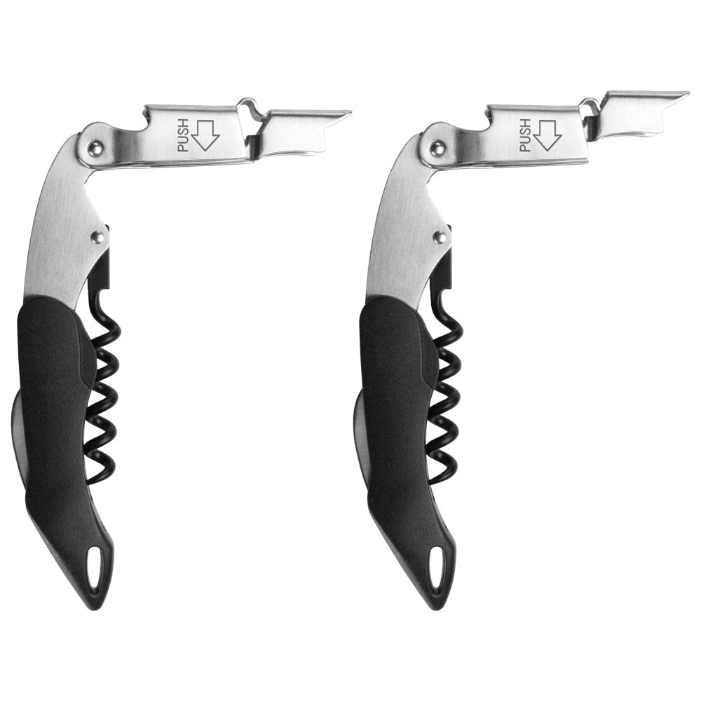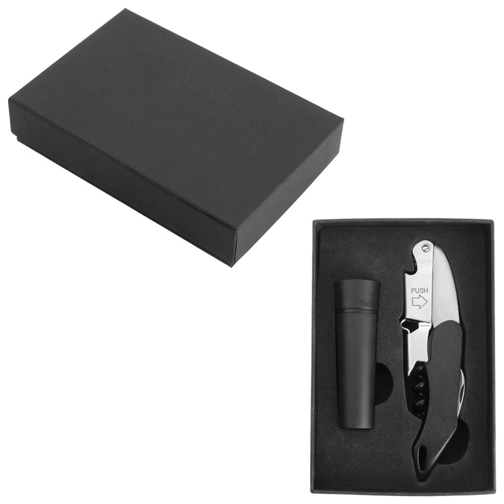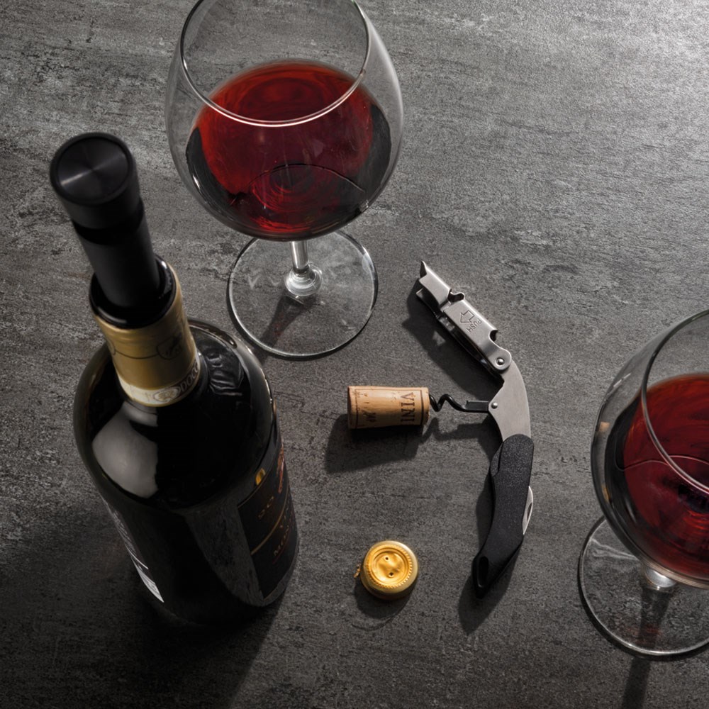 Dieses Weinset enthält einen zweihebeligen Korkenzieher aus Metall mit Kunststoffgriff und einen Vakuumverschluss aus Kunststoff. Der Korkenzieher enthält außerdem einen Kapselschneider. Der Verschluss ist für Standardflaschen geeignet.