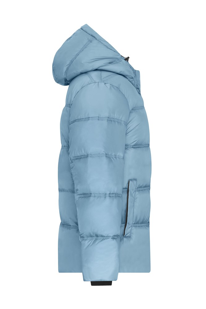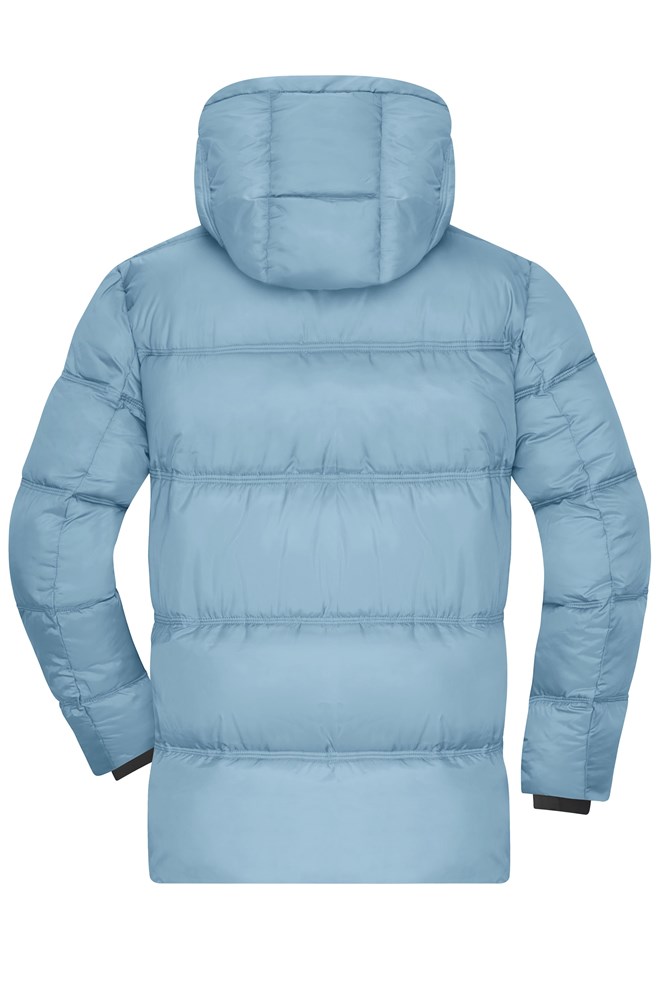 A voluminous quilted winter coat made of recycled polyester Sugenro filling divided into large chambers 2 zipped side pockets Full-length 2-way zip 2 large inner pockets Adjustable and detachable hood Triple topstitching Elastic inner cuffs 1/2 chest: 59 cm 1/2 bottom width: 59 cm length from shoulder: 74 cm sleeve length: 68 cm BIONIC-FINISH®ECO GRS Standard Sugenro® GRS Insulation quilted 2-way zip fastener stand-up collar Hood Detachable Hood