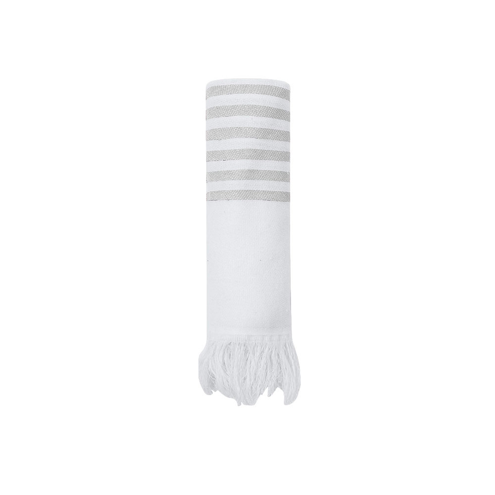 Soft pareo-towel of 3000 g/m², made from a combination of recycled cotton and recycled polyester SEAQUAL. Its design features a white base combined with colored stripes and distinguished fringes at the ends. Includes SEAQUAL design label, certifying its sustainable origin and contribution to ocean cleaning. SEAQUAL INITIATIVE works with collaborators and authorities to help clean our oceans. Marine waste from our beaches, ocean floors, and surfaces, rivers, and estuaries is collected through cleaning programs. It is then sorted into different types of materials, and the plastic portion is cleaned and transformed into RECYCLED MARINE PLASTIC, a fully traceable raw material that creates sustainable and inspiring products. By choosing products that contain RECYCLED MARINE PLASTIC, you are helping to clean our oceans. TOGETHER FOR A CLEAN OCEAN.