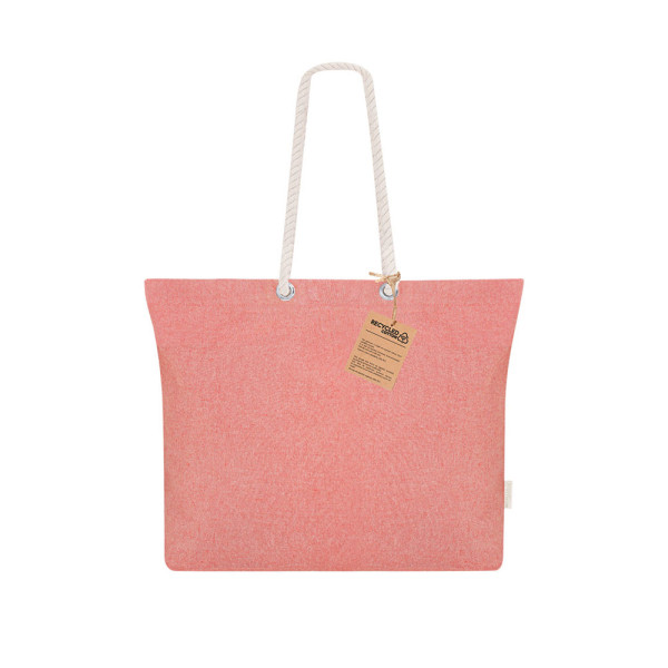 Bag made mainly from Recycled Cotton of 220g/m2. With gusset and long cotton handles in natural color and braided design. Includes recycled cotton label.