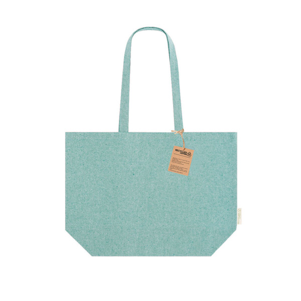 Bag mainly made of recycled cotton 220 g/m2 with gusset. Long handles of 70 cm with reinforcement, sewn finish. Logo on the side label and resistance up to 6 kg weight.