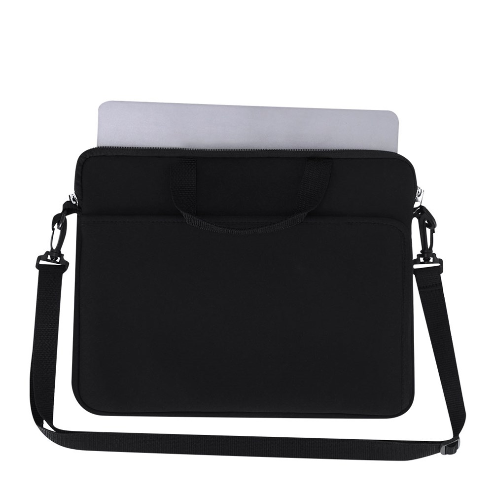 Soft shell laptop sleeve, with padded main compartment for devices up to 14 inches. Designed with double pull zipper closure and a practical external quick access pocket. Easy to transport thanks to its hand straps, adjustable shoulder strap, and rear strap for trolley.