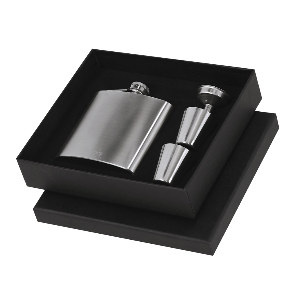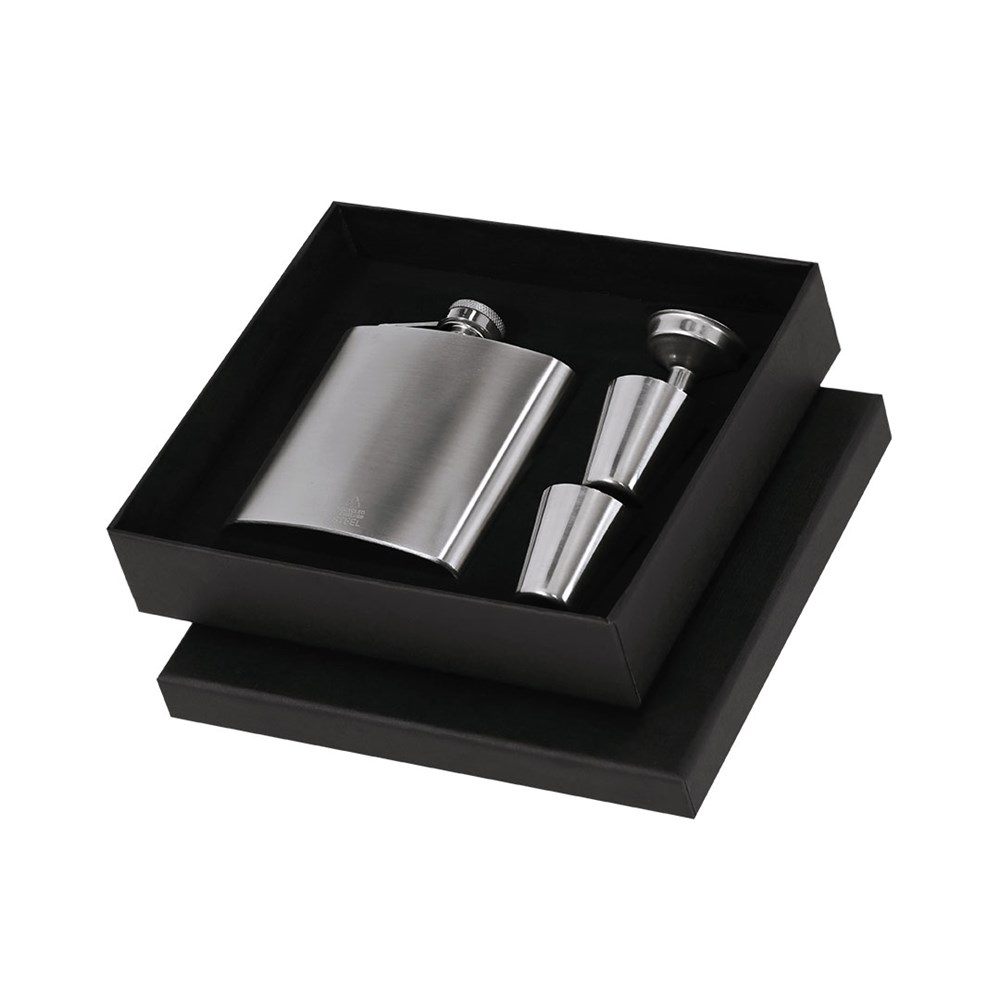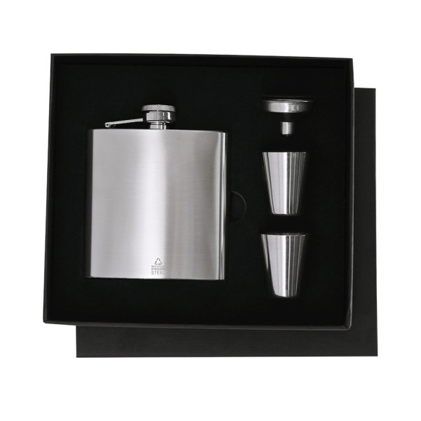 Flask set with accessories in Recycled Stainless Steel. Includes:- 175 ml flask with drip-free system and screw closure for safe storage without spills.- Two measuring cups of 30 ml capacity.- Dosage funnel, which facilitates filling.Includes Recycled Stainless Steel label. Presented in a black box.Steel is one of the most demanded materials and can be found almost everywhere, from daily-use products to large constructions. With countless properties, among which durability and high level of reusability stand out, making it a highly valued alternative in sustainability solutions. Properly treated, it allows obtaining new resources of infinite use.