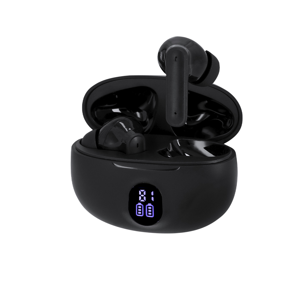 Wired in-ear headphones with Bluetooth® 5.4 connectivity, with hands-free function and noise cancellation. Ergonomically designed, include a touch control button integrated into the earbud, with matching charging base and exterior battery status display for each earbud. Integrated 230 mAh battery. Instruction manual in Spanish and English.