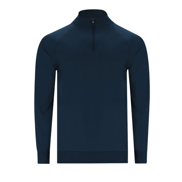 Technical sweatshirt with a brushed interior for added warmth and softness. Designed with raglan sleeves and a half-zip collar, featuring tone-on-tone reinforced neck tape. The back of the neck, cuffs, and hem are made from 1x1 ribbed fabric for a comfortable fit. Includes side seams for enhanced structure and durability.