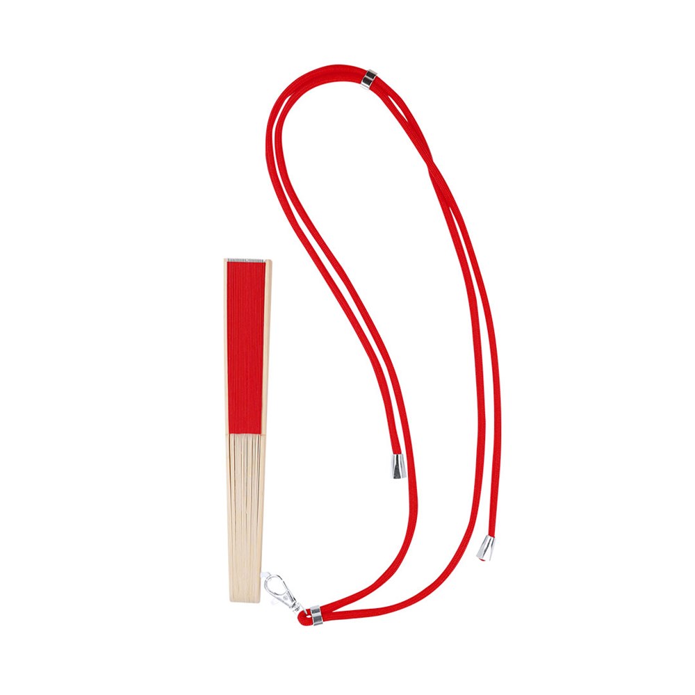 Fan made of durable 190T polyester fabric and flexible bamboo sticks. Includes an adjustable cord matching the fabric and a practical metal carabiner for easy transport.Materials like bamboo promote the use of natural raw materials, reducing polluting emissions. Additionally, bamboo comes from a highly resilient and versatile plant, growing and regenerating quickly, making it an excellent alternative to traditional wood use.