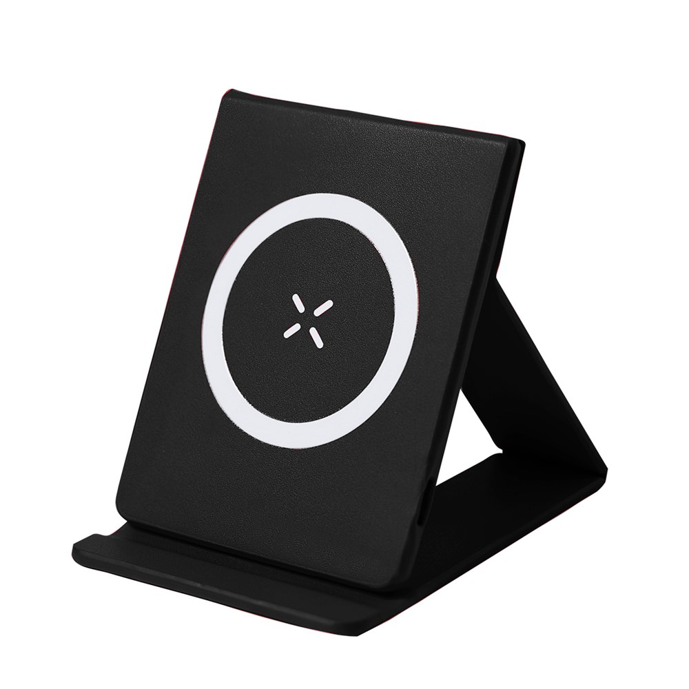15W magnetic wireless charger, made from PU. Includes a foldable stand, with the possibility of several smartphone positions, and a charging status indicator. Compatible with devices equipped with wireless charging technology. Includes 1m USB charging cable, with Type C input connector, and a metallic ring with adhesive. User manual available in Spanish and English.