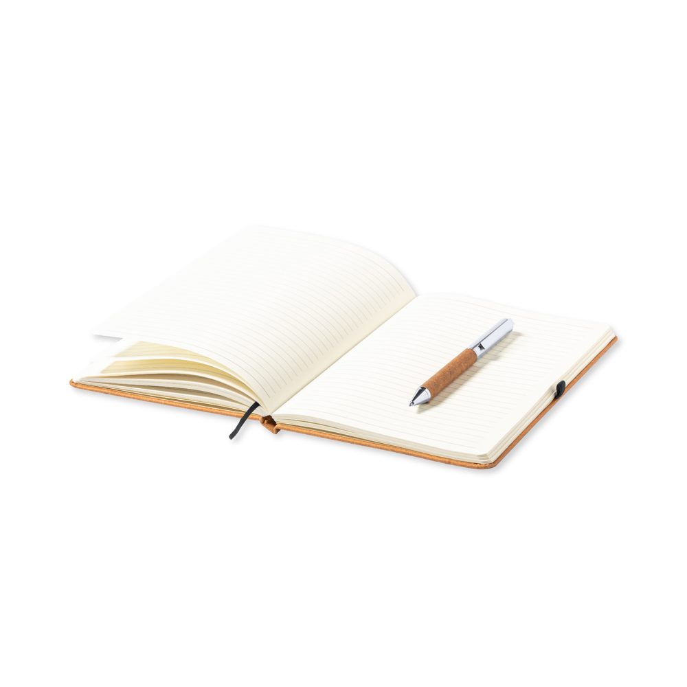 Set of notepad and ball pen in recycled leather. Including:Notepad with hard covers in recycled leather, with 100 inner sheets in striped layout. Including bookmark, elastic binding and ball pen holder in matching color. With the distinctive of recycled leather at the back cover.Ball pen made in chrome plated metal with recycled leather barrel. Stylish metal clip and matching accessories, twist mechanism and blue ink. With the distinctive of recycled leather on the barrel.Set presented in an elegant kraft design case, with independent compartment for notepad and ball pen.Recycled leather recovers the fibers discarded in the manufacturing processes of leather, minimizing the waste of material, contributing to reduce the environmental impact, and preserving at the same time the original features of the leather.