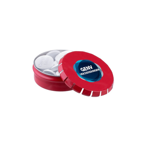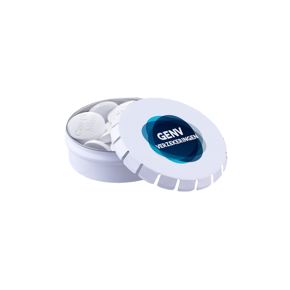 Mini clic-clac tin white filled with approx. 23 gram Compli'mints, including ingredients sticker and seal.