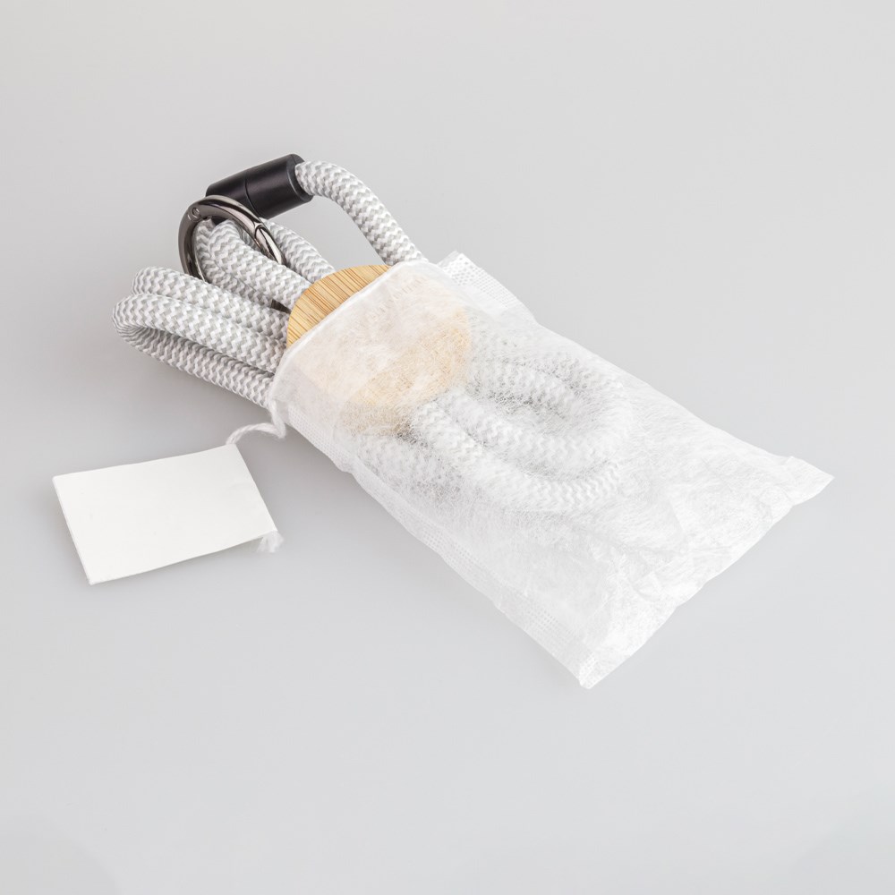 Sustainable lanyard made from recycled PET with bamboo slider. Ideal for events and promotions. Engravable wooden slider and metal key ring. Available in four colors or customized according to PANTONE®.