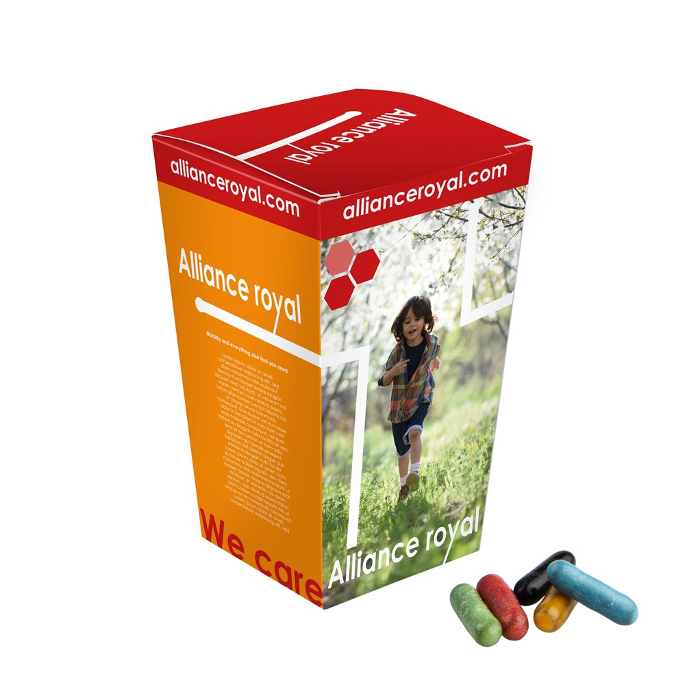 Full color printed box for car cup holder, filled with approx. 250 grams of Licorice sticks mix