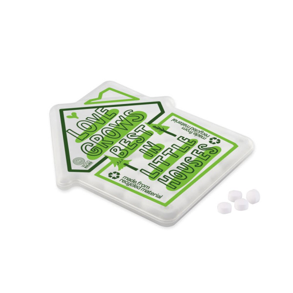 White mint dispenser in the shape of a house, printed in 1 or 2 colors on the top, filled with approx. 8 grams of sugar-free peppermints, without Aspartame