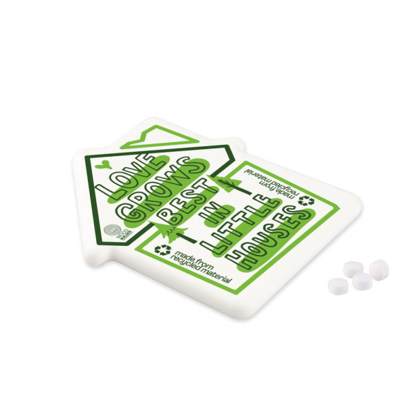 White mint dispenser in the shape of a house, printed in 1 or 2 colors on the top, filled with approx. 8 grams of sugar-free peppermints, without Aspartame
