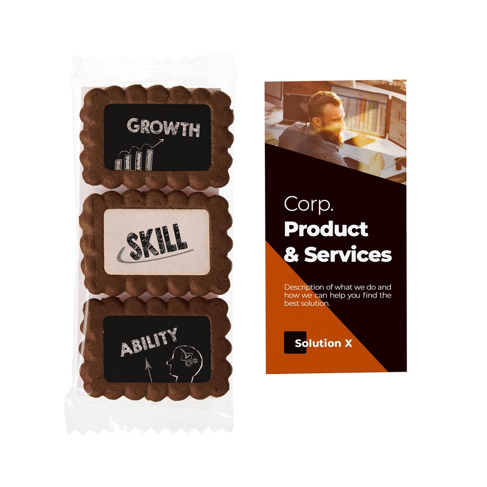 3 caramel-flavored cookies, approx. 15 grams in transparent foil. Features full color printing on the cookie and a full color paper background card