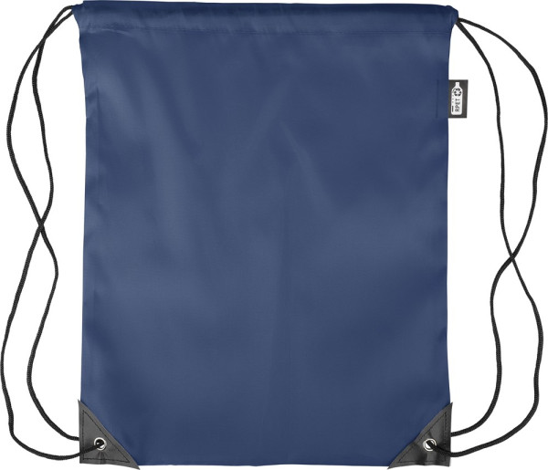 rPET polyester 210D drawstring backpack with two black PU corners on the front and internal sewing. Features a black nylon cord on each side, a pull-cord closure. Capacity: 5L. Carrying capacity: 7 kg. Includes an rPET label.