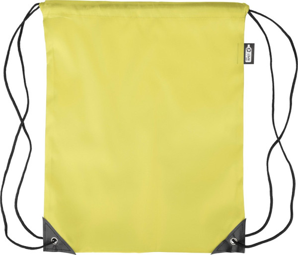 rPET polyester 210D drawstring backpack with two black PU corners on the front and internal sewing. Features a black nylon cord on each side, a pull-cord closure. Capacity: 5L. Carrying capacity: 7 kg. Includes an rPET label.