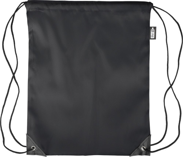 rPET polyester 210D drawstring backpack with two black PU corners on the front and internal sewing. Features a black nylon cord on each side, a pull-cord closure. Capacity: 5L. Carrying capacity: 7 kg. Includes an rPET label.