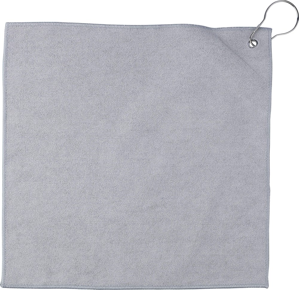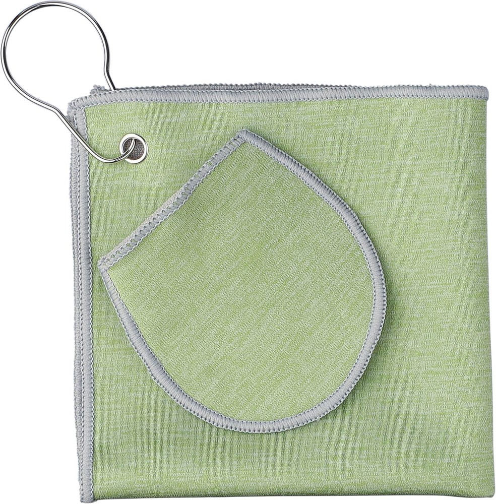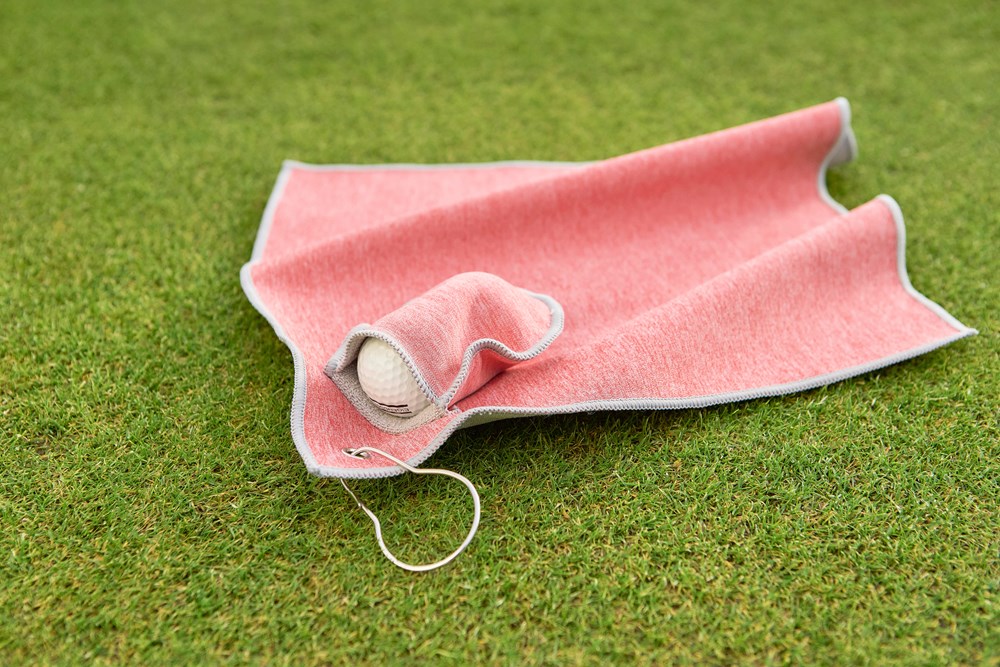 rPET golf towel with an integrated golf ball pouch, measuring approximately 31 x 31 cm. Features a metal hook for easy attachment to your bag and includes an rPET label inside. Machine washable (cold).