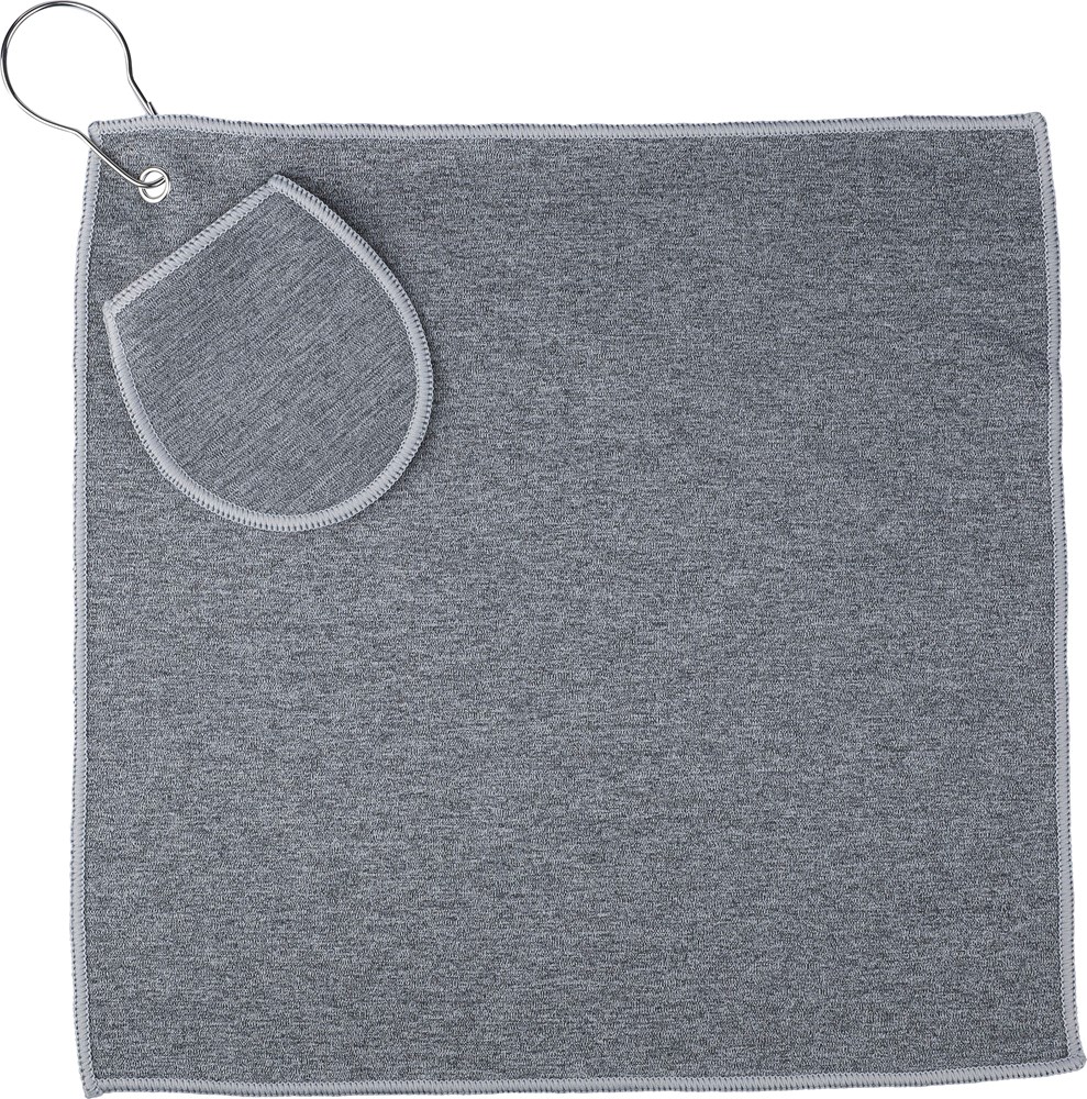 rPET golf towel with an integrated golf ball pouch, measuring approximately 31 x 31 cm. Features a metal hook for easy attachment to your bag and includes an rPET label inside. Machine washable (cold).