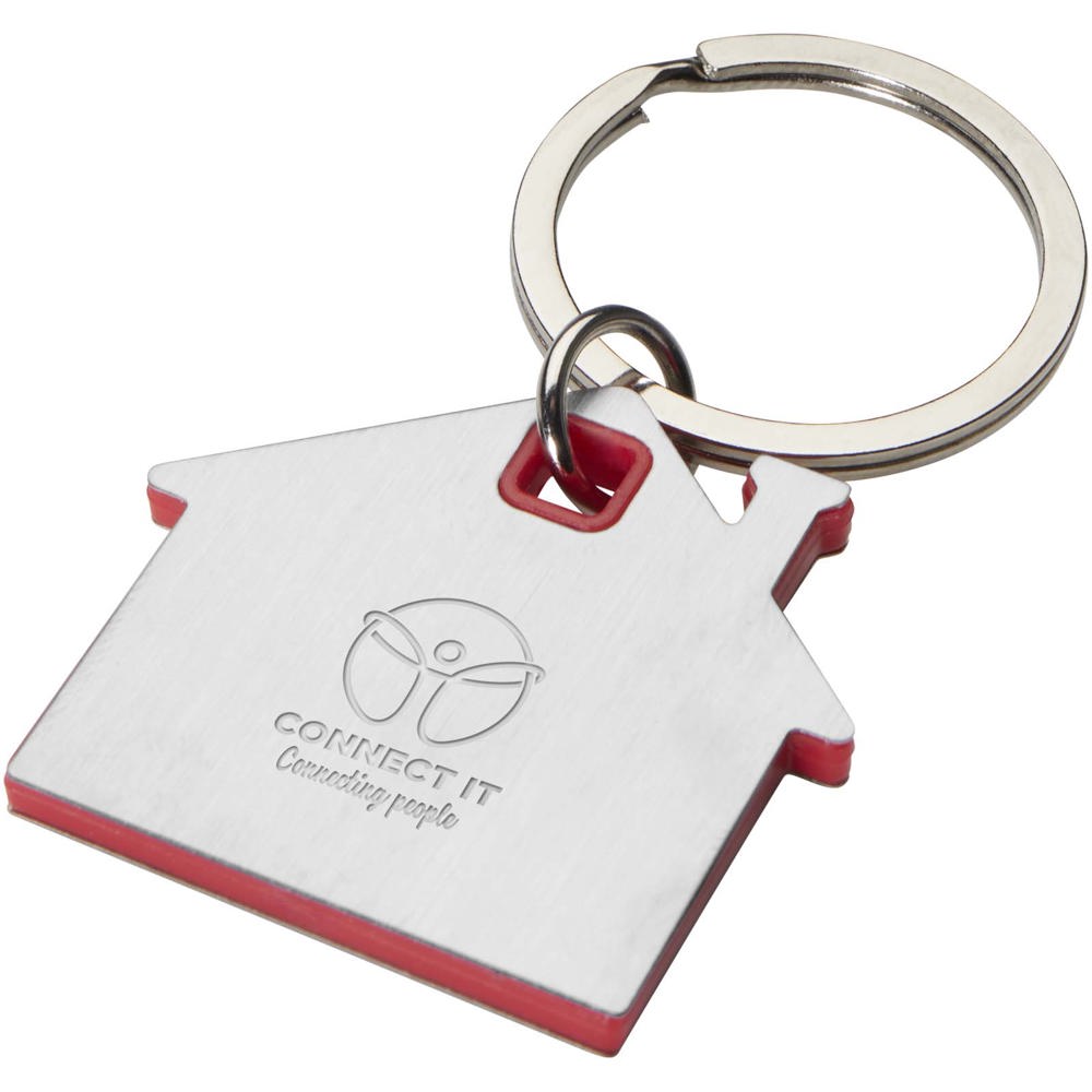 House-shaped keychain with a stainless steel plate with a frosted design front and back, and a coloured plastic chip in the middle.