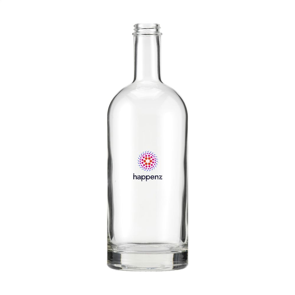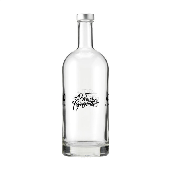 Stylish glass water bottle with screw cap and a sturdy base. The timeless design makes this bottle ideal as a table bottle and particularly suitable for use in the catering industry. The bottle is dishwasher-safe, the cap is not dishwasher-safe. Washing by hand is recommended to preserve the imprint. Capacity 1L.