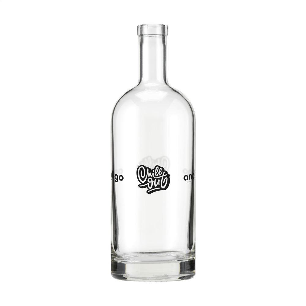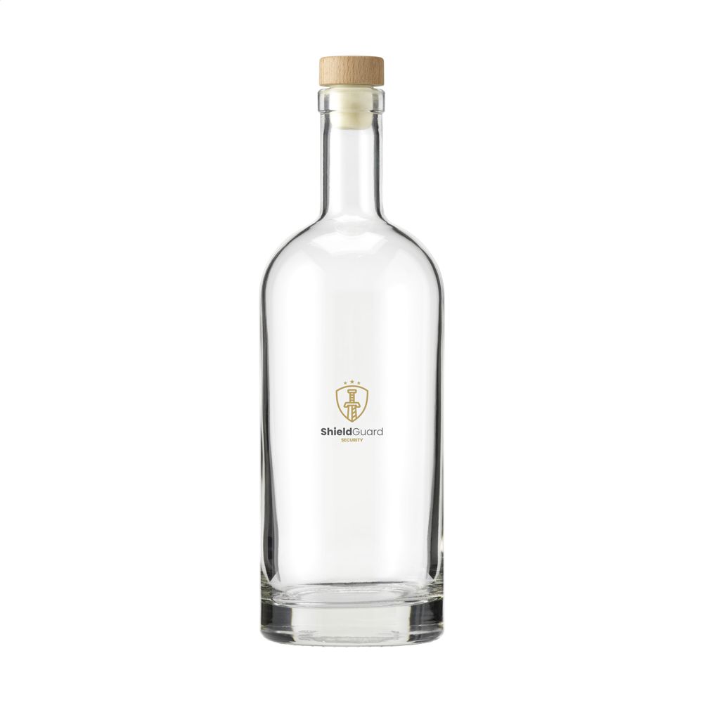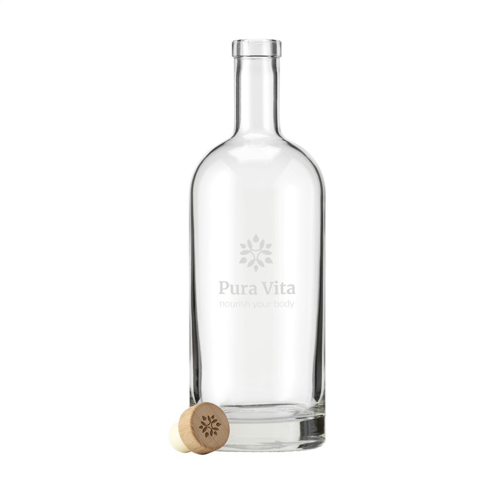 Stylish glass water bottle with wooden cap fitted with a synthetic cork and a sturdy base. The timeless design makes this bottle ideal as a table bottle and particularly suitable for use in the catering industry. The bottle is dishwasher-safe, the cap with cork is not dishwasher-safe. Washing by hand is recommended to preserve the imprint. Capacity 1L. Made in Europe.