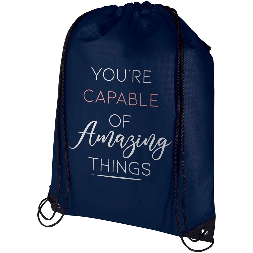 Made from durable and tear resistant non-woven RPET, the Evergreen GRS certified recycled drawstring bag is a great option when looking for an easy-to-handle gift to promote any brand or marketing campaign. This lightweight bag is budget-friendly and has a drawstring design suitable for easy carrying over the shoulder or as a backpack. Volume capacity: 5 litres. Resistance up to 5 kg weight.
