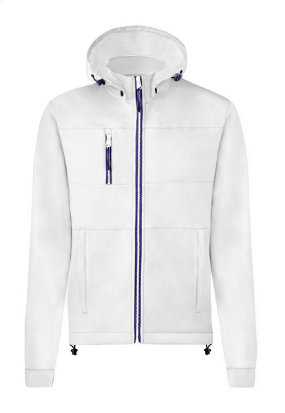 Wind and waterproof, zipped softshell jacket with 2 side pockets, 1 front pocket, stand-up collar and detachable hood. 100% polyester, 300 g/m².