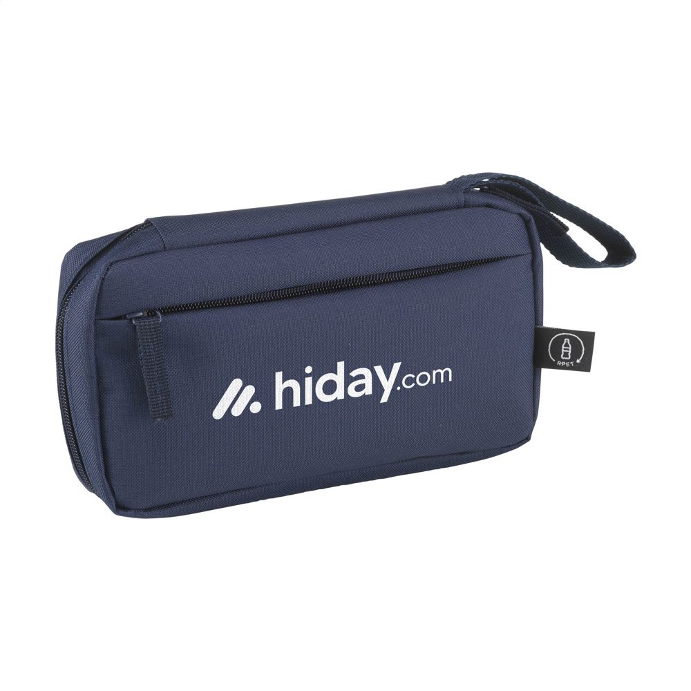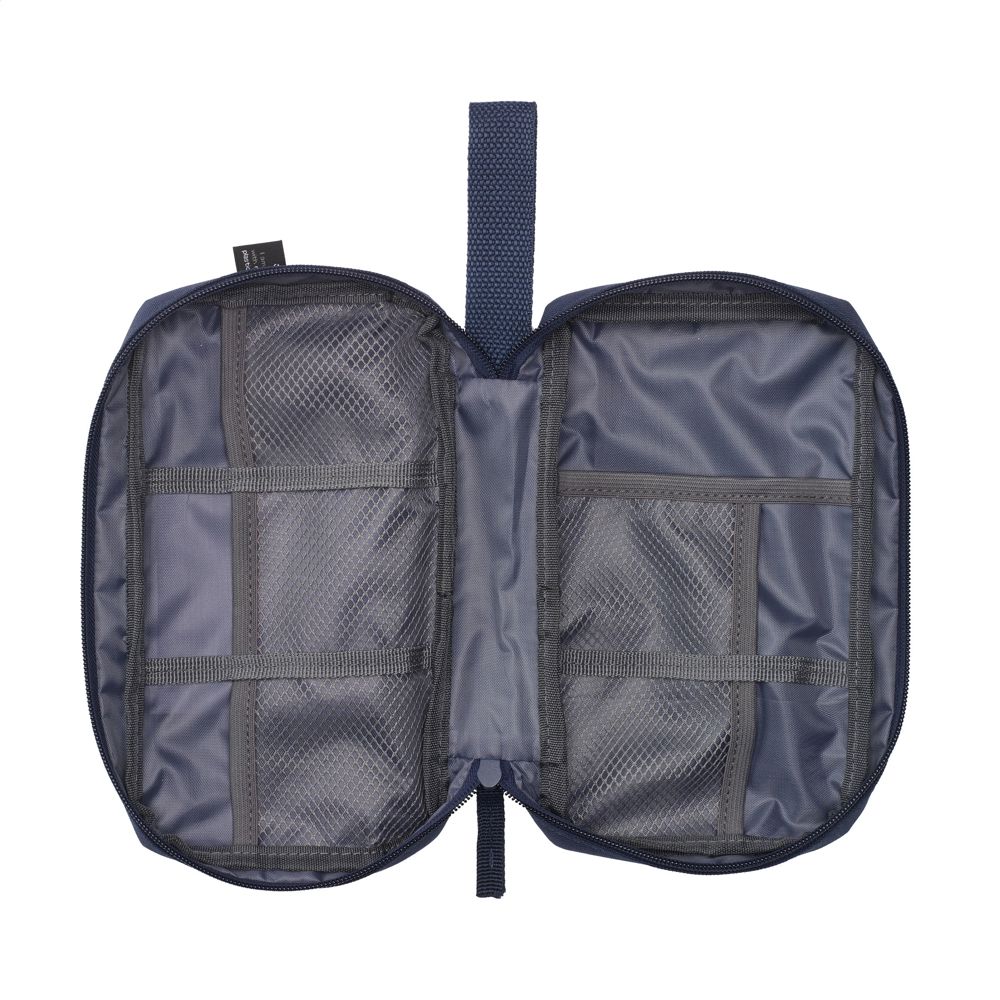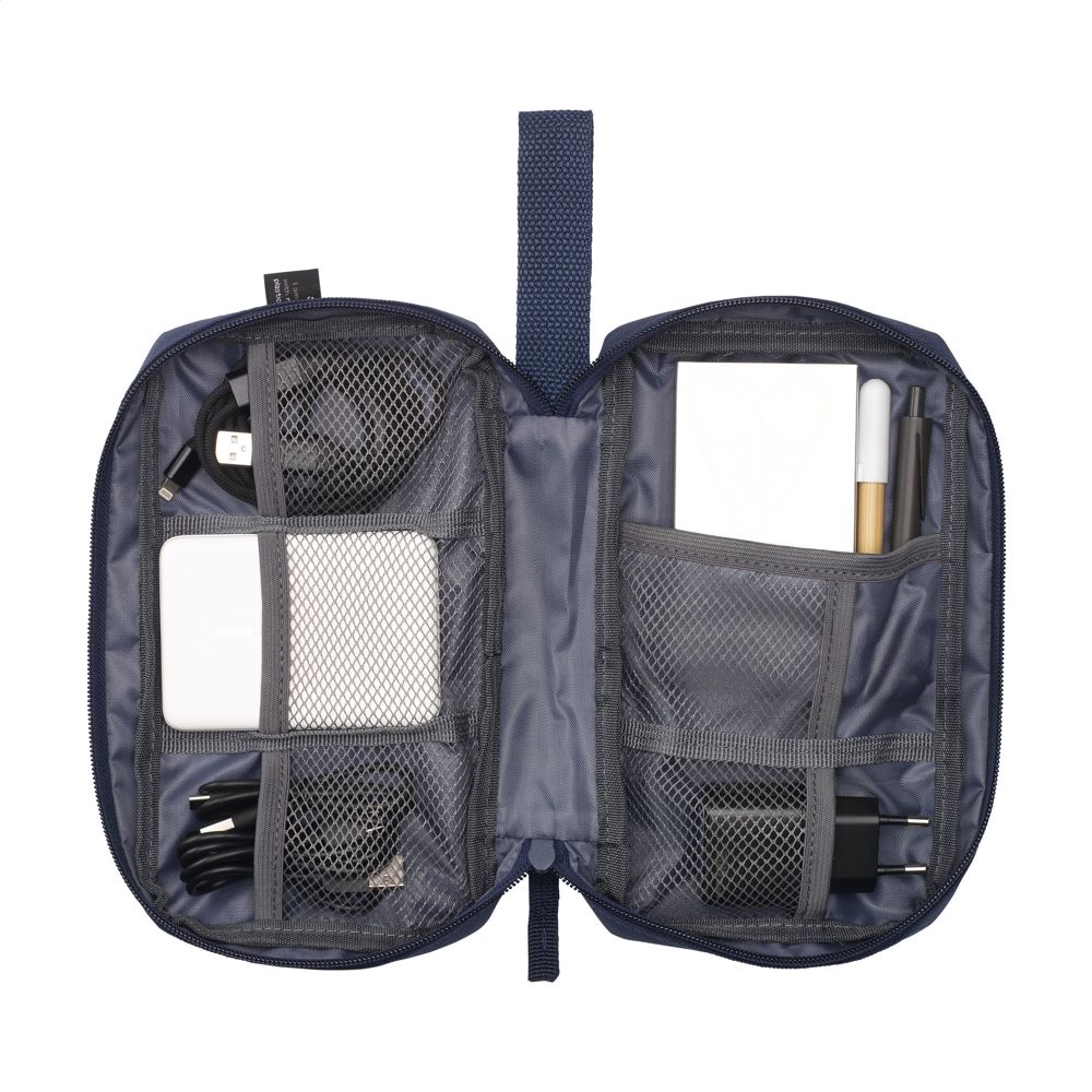 Pouch for organised and clear storage of cables, chargers and technical accessories. Made from 600D RPET polyester. The inside offers ample storage space, divided into several (mesh) compartments. With zip closure, an extra zip pocket on the exterior and a practical carrying loop. Ideal for travelling, but also handy at home or in the office. GRS-certified. Total recycled material: 88%.