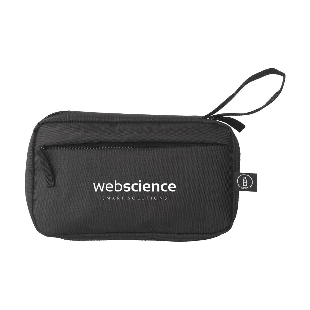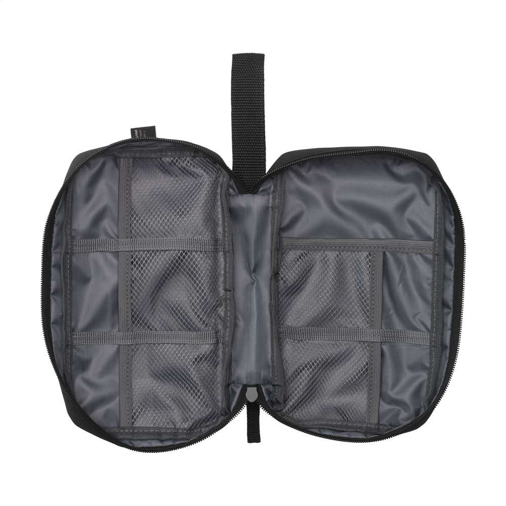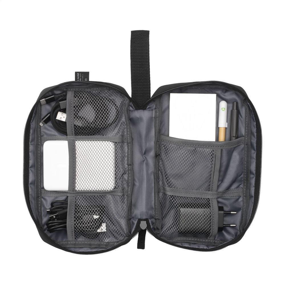 Pouch for organised and clear storage of cables, chargers and technical accessories. Made from 600D RPET polyester. The inside offers ample storage space, divided into several (mesh) compartments. With zip closure, an extra zip pocket on the exterior and a practical carrying loop. Ideal for travelling, but also handy at home or in the office. GRS-certified. Total recycled material: 88%.