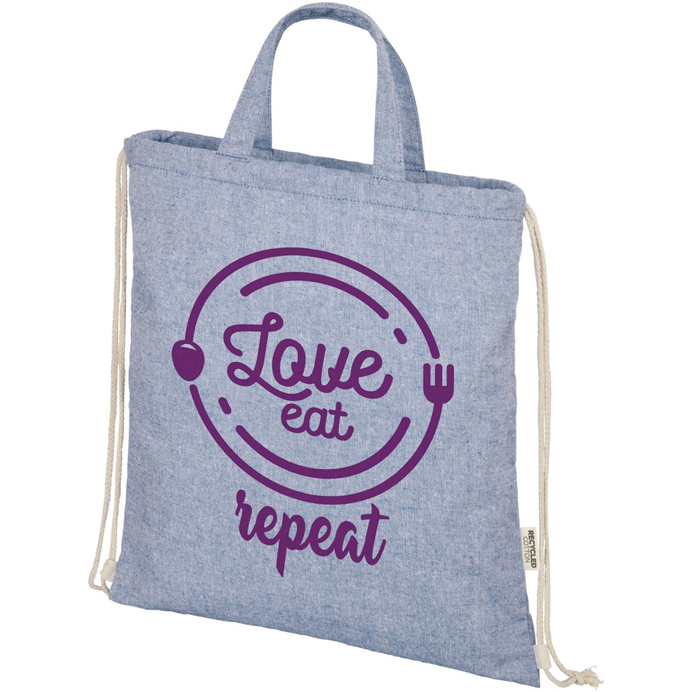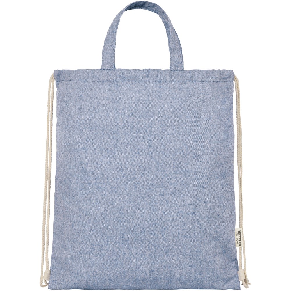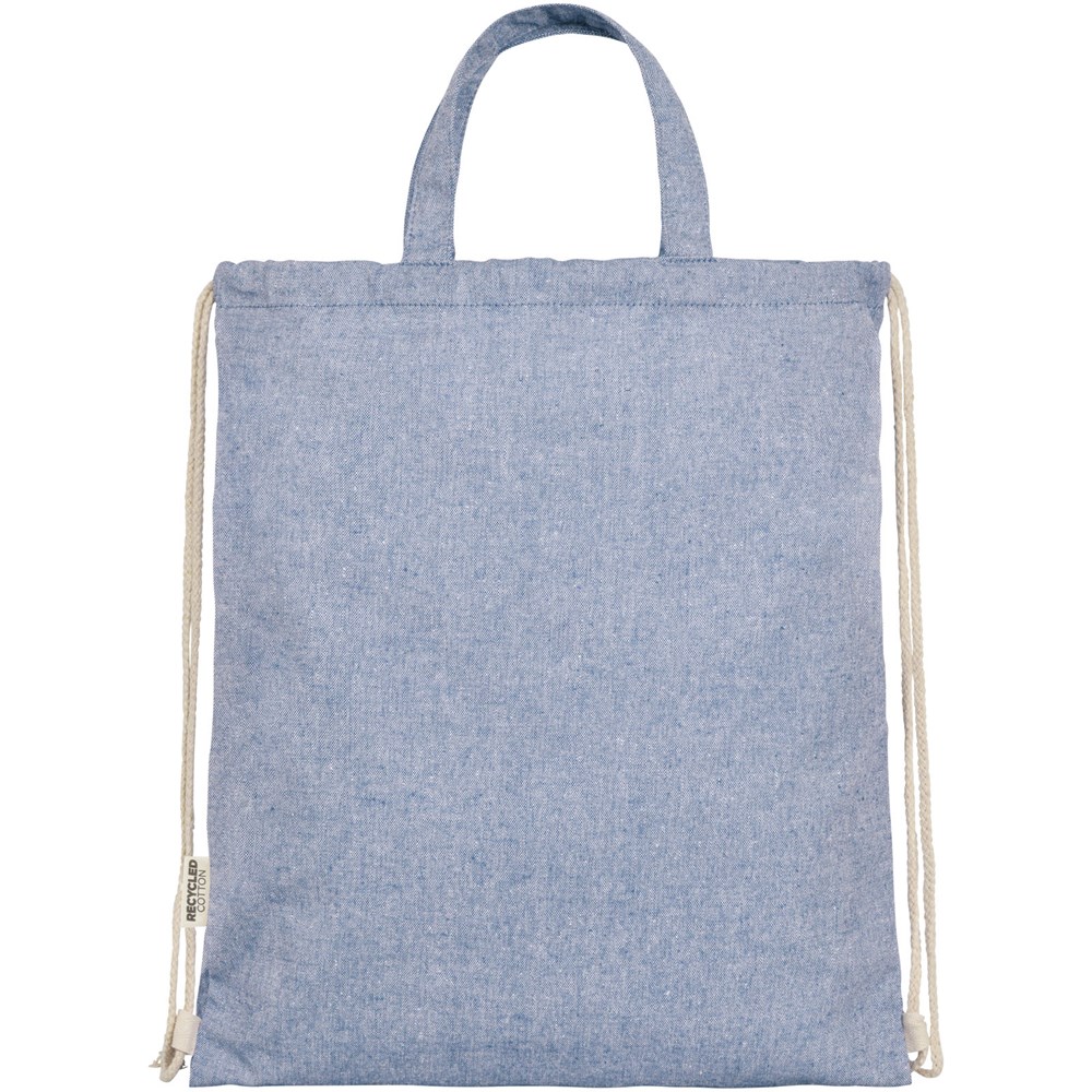 Drawstring bag made of a 150 g/m² recycled cotton polyester blend. Large main compartment with cotton drawstring closure in natural colour. Recycled cotton is manufactured from pre-consumer waste generated by textile factories during the cutting process. Similar colours are blended together so no additional dyeing is required. Due to the nature of recycled cotton, there may be a very slight colour variation. This distinctly adds to a more authentic appearance. Each backpack also comes with an Aware™ tracer. This innovative feature allows users to trace the origins and journey of their item through a QR code, enhancing transparency in the supply chain and fostering a stronger connection between the product and its production process. Resistance up to 5 kg weight. Handle length: 14 cm.