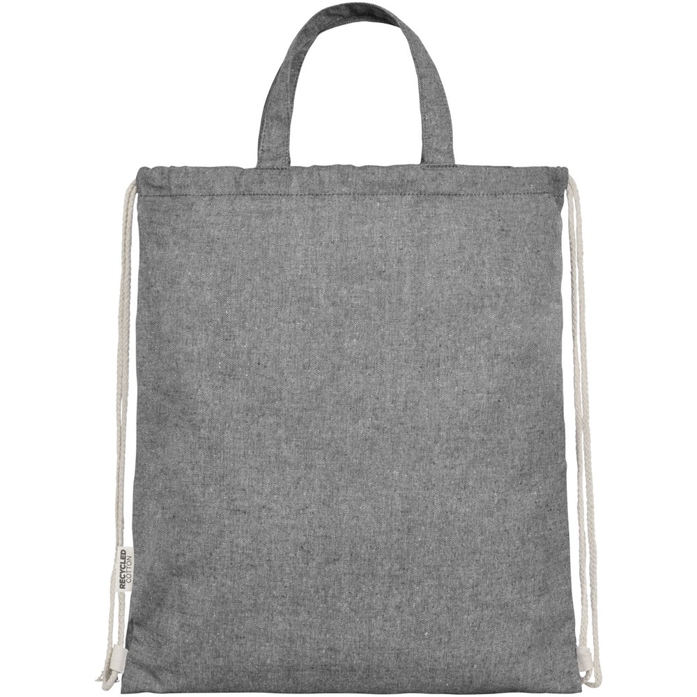 Drawstring bag made of a 150 g/m² recycled cotton polyester blend. Large main compartment with cotton drawstring closure in natural colour. Recycled cotton is manufactured from pre-consumer waste generated by textile factories during the cutting process. Similar colours are blended together so no additional dyeing is required. Due to the nature of recycled cotton, there may be a very slight colour variation. This distinctly adds to a more authentic appearance. Each backpack also comes with an Aware™ tracer. This innovative feature allows users to trace the origins and journey of their item through a QR code, enhancing transparency in the supply chain and fostering a stronger connection between the product and its production process. Resistance up to 5 kg weight. Handle length: 14 cm.