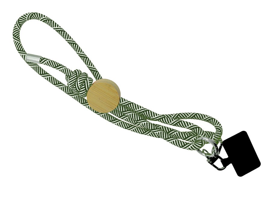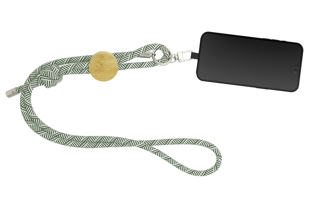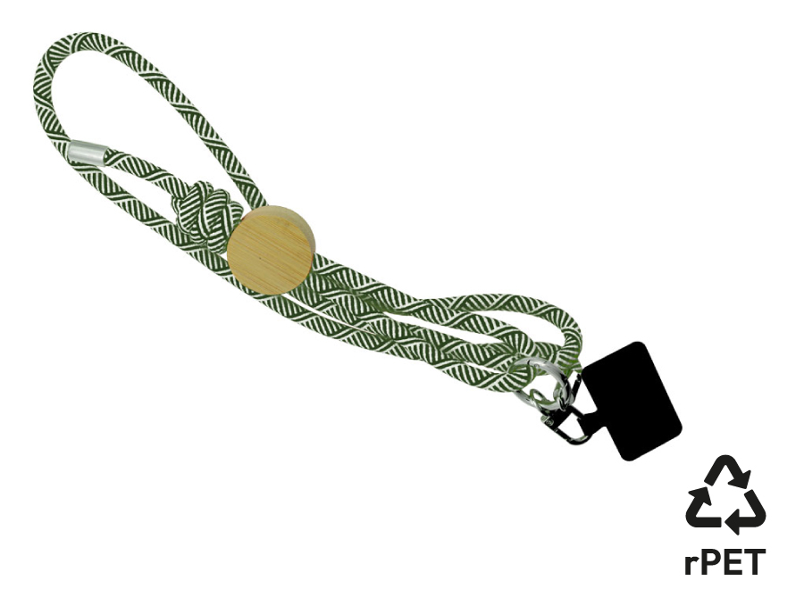 RPET necklace, 160cm long and 8mm thick. Universal and detachable pad in polyester to secure your phones by using their case. Stainless steel ring and lace ends. Bamboo loop provided.