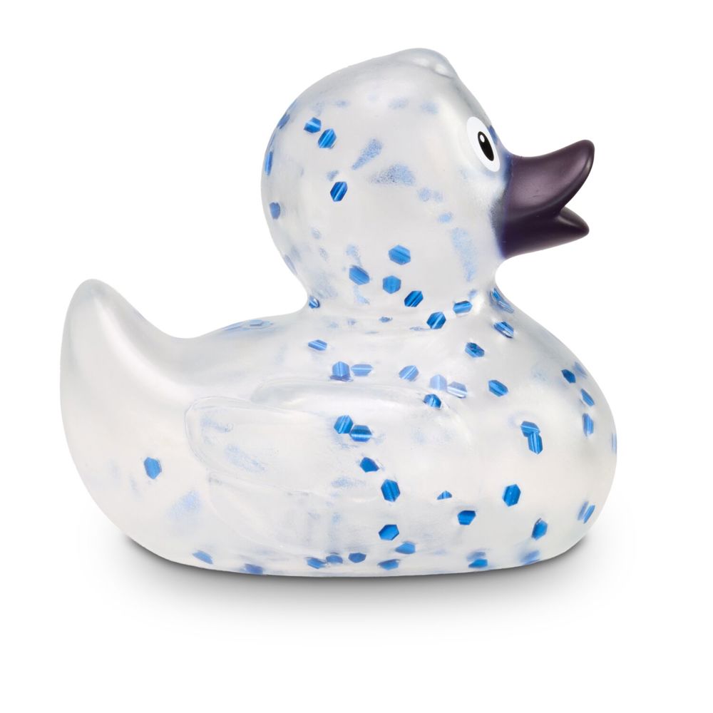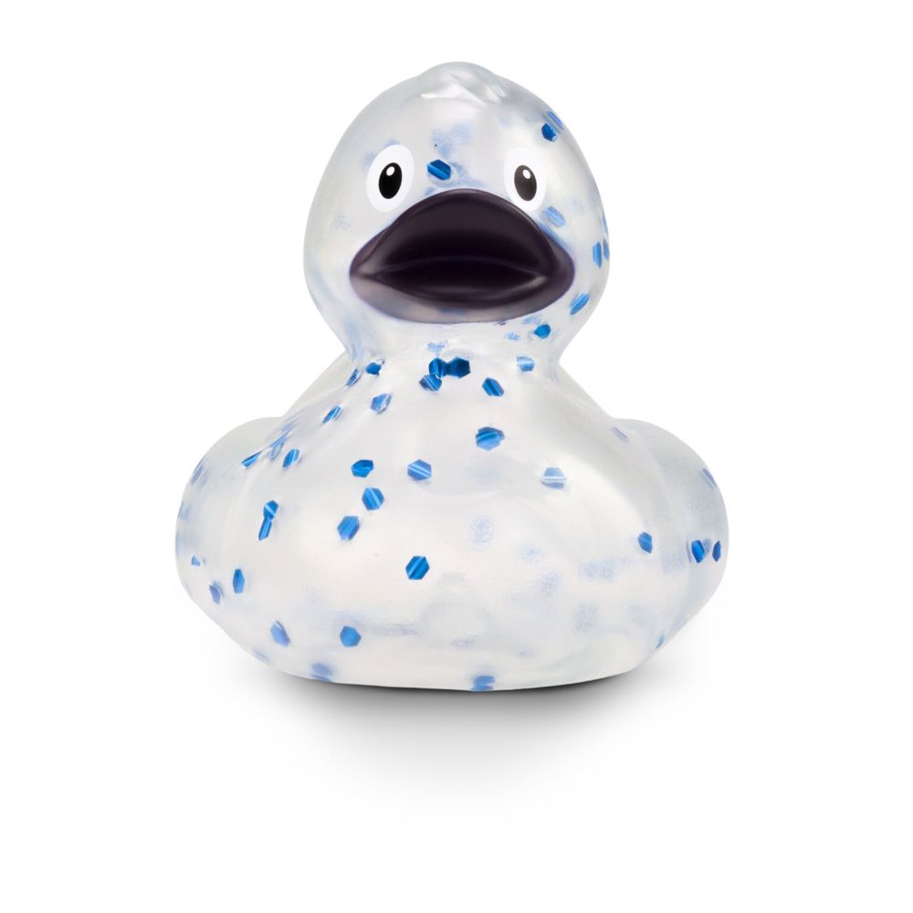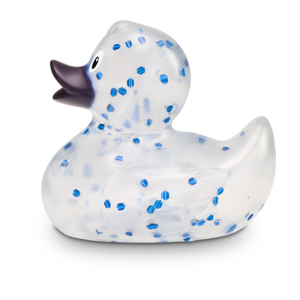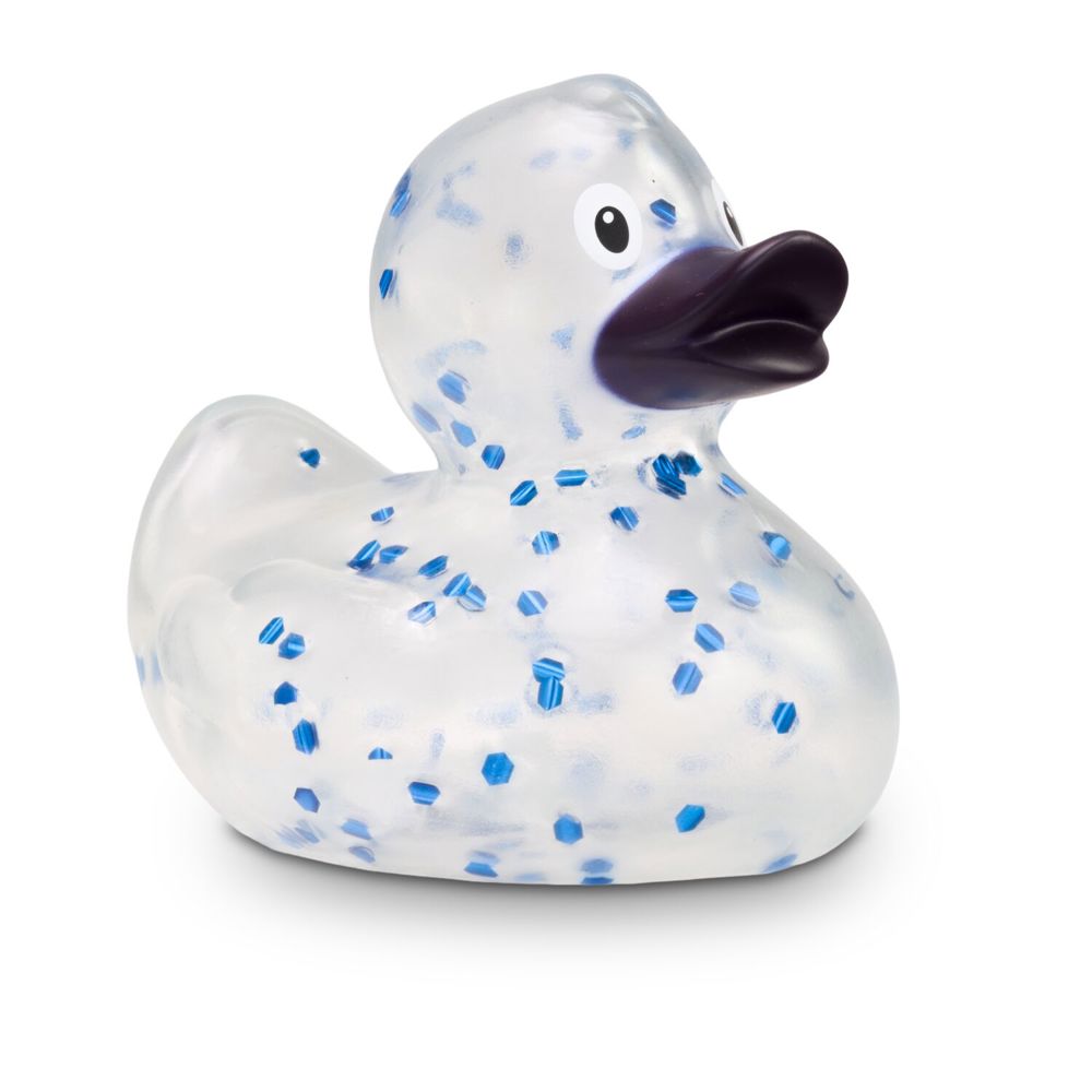 Bibi Blue Glitter turns every place into a party. She wears a transparent dress with shimmering blue glitter confetti and a royal blue beak. With her beautifully shaped, timeless body, Bibi is a rubber duck classic. She has many big and little siblings, also in other colors. Size: approx. 8 cm. Includes squeaker valve