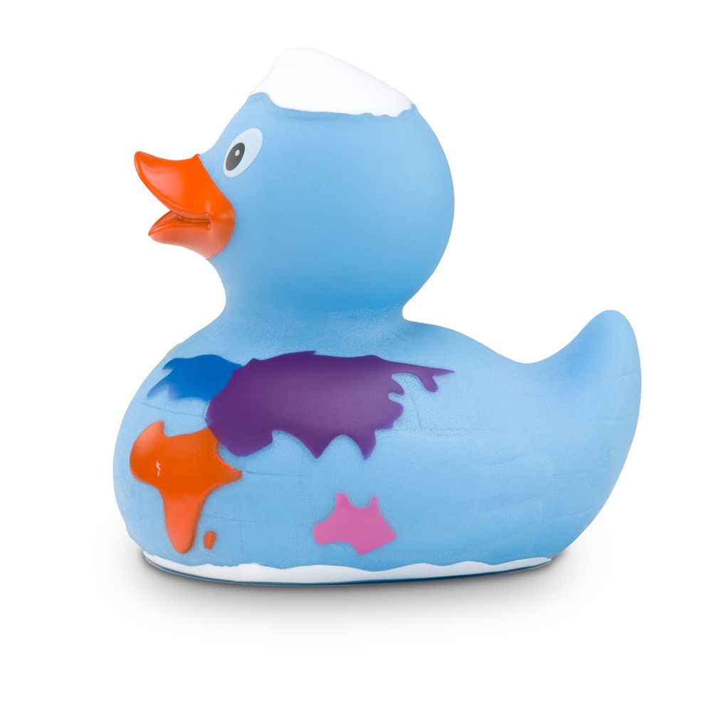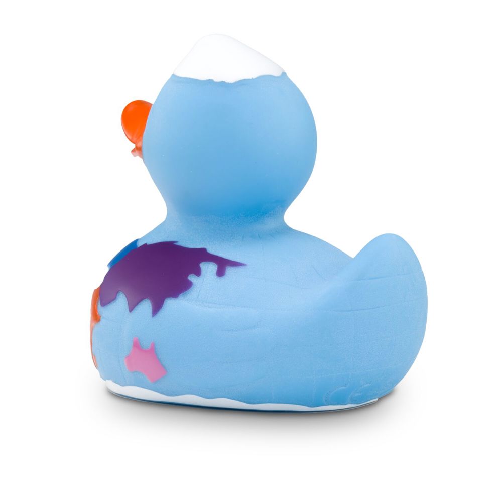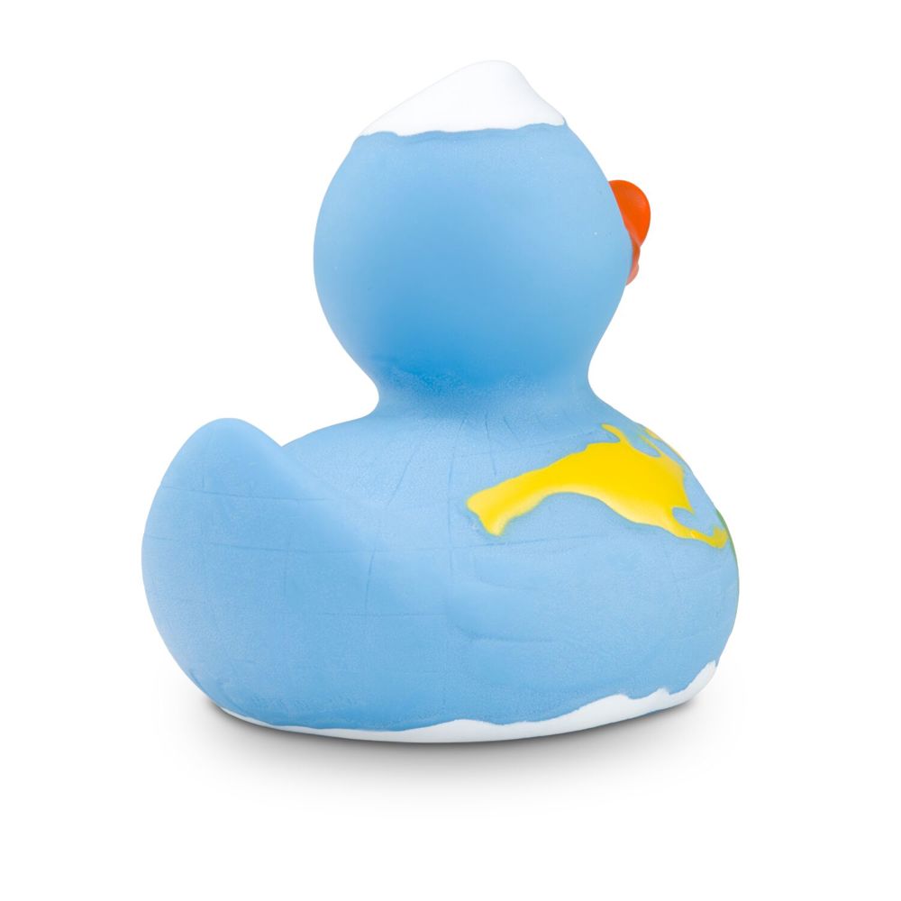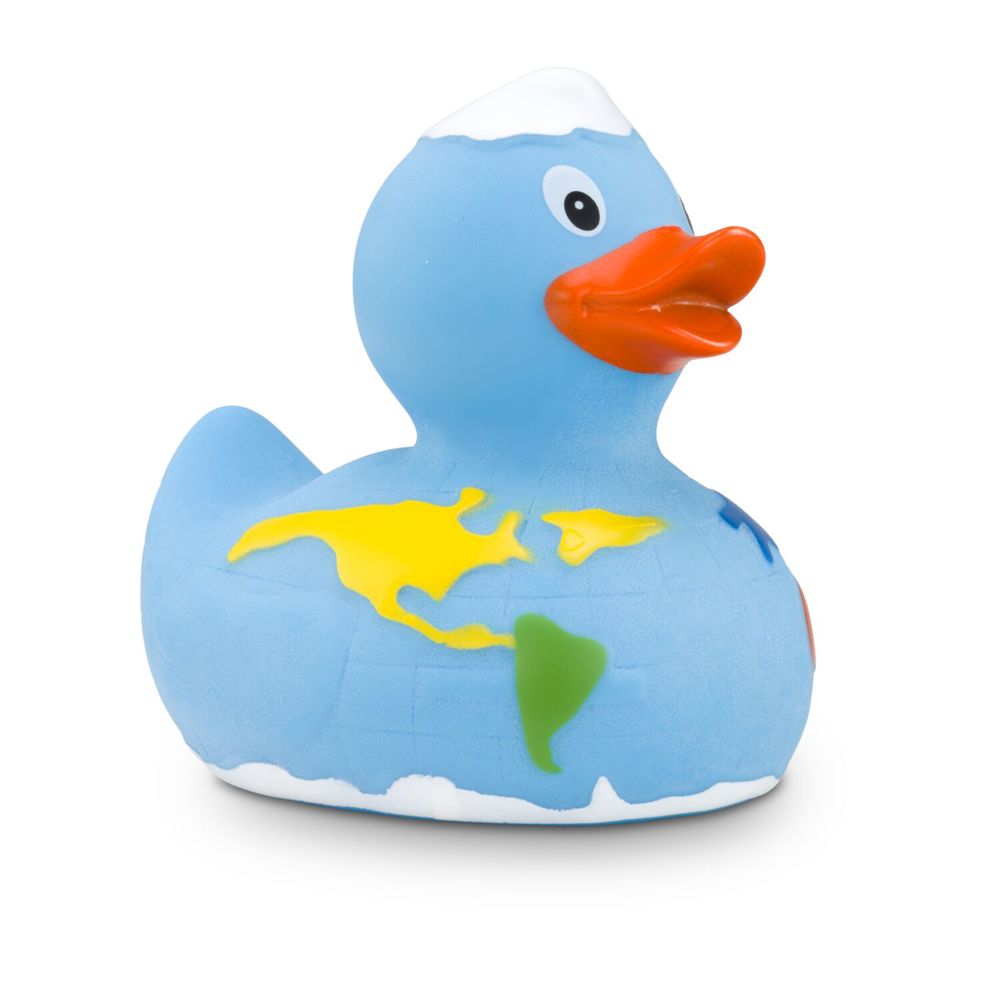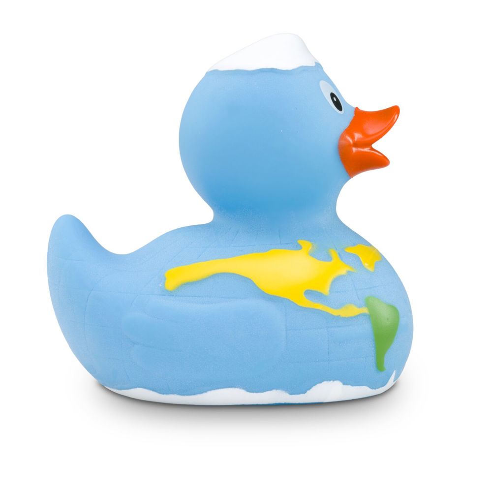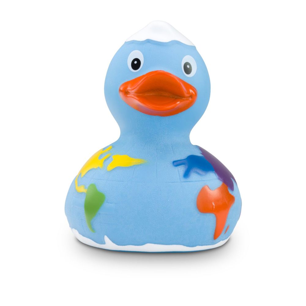 Erna Erdkugel has already traveled the whole world. This light blue squeaky duck looks like a globe with colorful continents all around and proudly wears the white North Pole on her head. Ideal as a gift for travel enthusiasts, adventurers, geography fans, or as a creative promotional item for travel agencies and educational institutions. With Erna Erdkugel, every bubble bath becomes an exciting journey around the world. Size: approx. 8 cm. Includes squeaker valve.