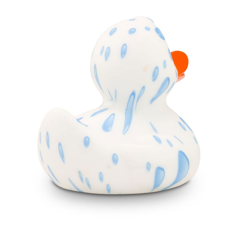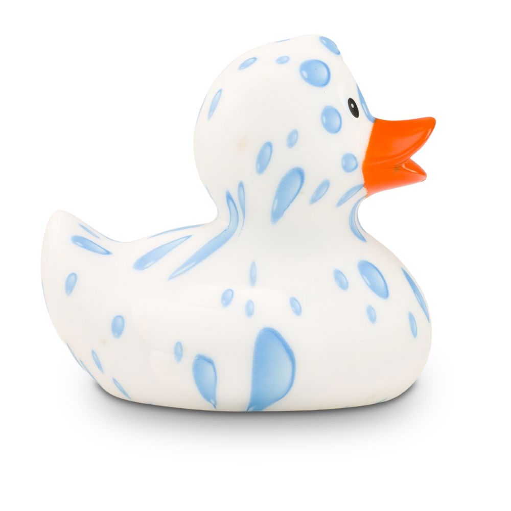 Tommy Tropfen likes to hang out in cool water. His white plumage is adorned with numerous water droplets in various shapes. He has an orange beak. This promotional duck is ideal for bathrooms or waterworks. Thanks to the special manufacturing process, no two Patrick Plansch ducks are alike - each duck is unique. Size: approx. 8 cm. Includes squeaker valve