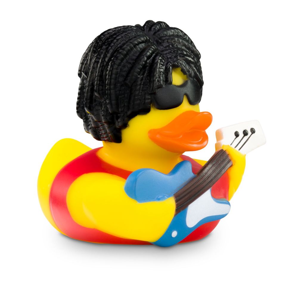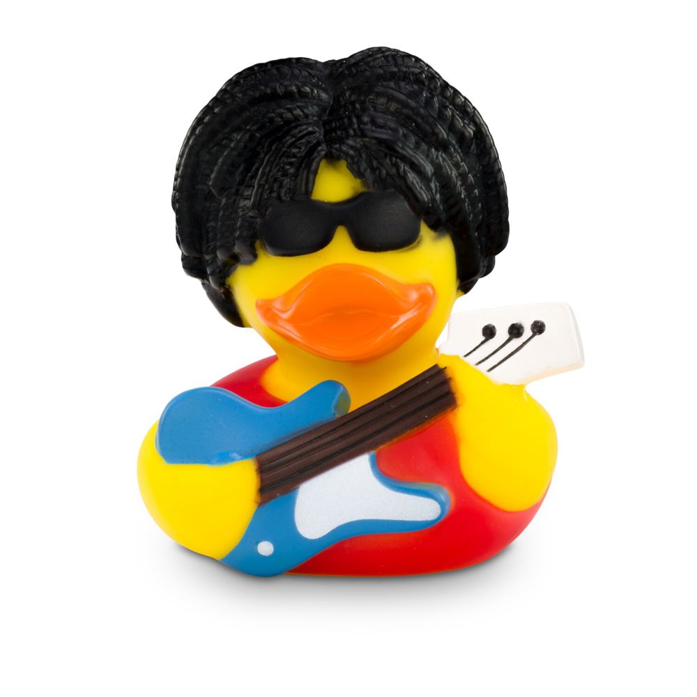 Bathing duck Ringo Rockstar brings rock ‘n’ roll to the bathtub. With black curly hair, sunglasses, a red shirt, and a blue electric guitar, this duck is the star of every bath time. It's sure to put everyone in a good mood, and not just in the bathroom. Size: approx. 8 cm. Includes squeaker valve.