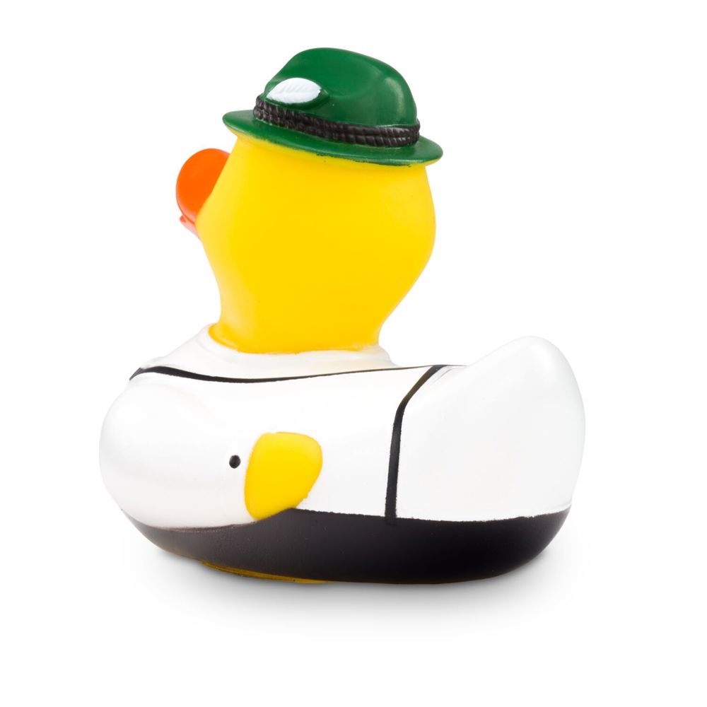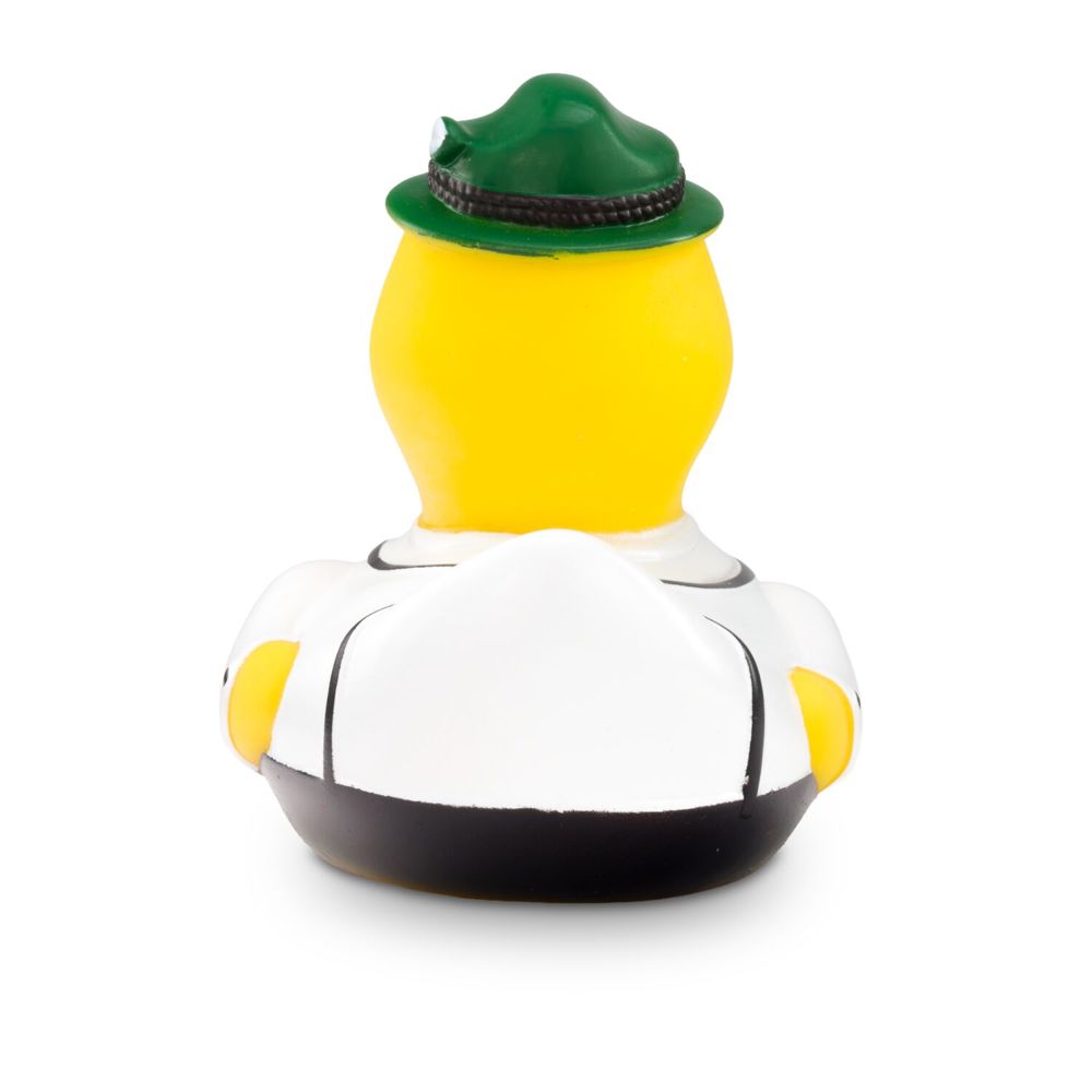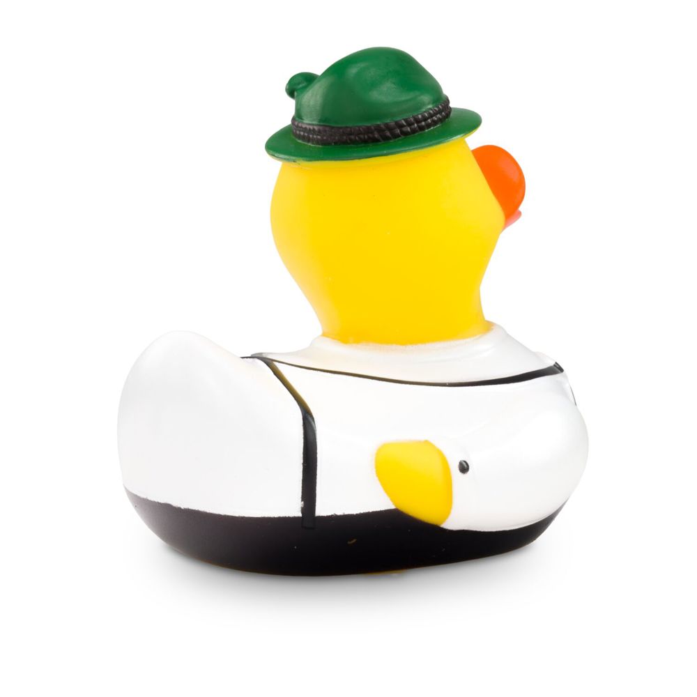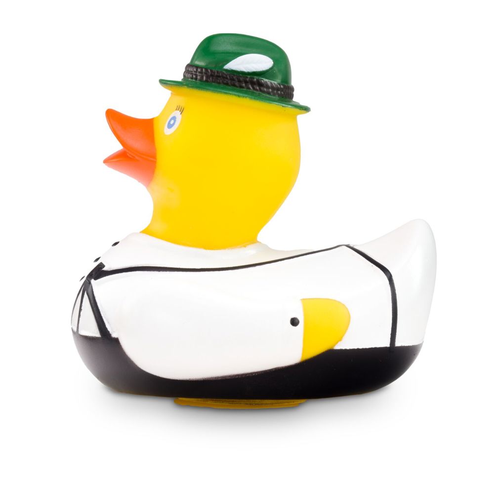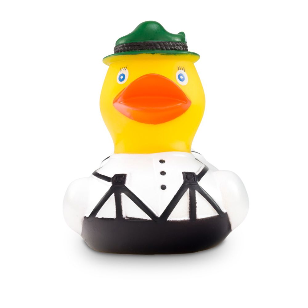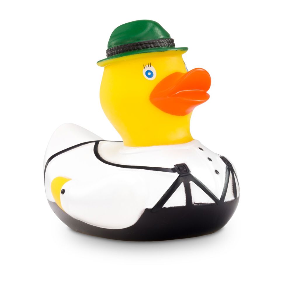 Ludwig Lederhose wears his Bavarian clothing with pride. The traditional brown lederhosen with suspenders combined with a white Alpine shirt make him look really smart. He wears a green felt hat on his head. The perfect duck for Bavarian, Tyrolean, or South Tyrolean folk festivals! Size: approx. 8 cm. Includes squeaker.