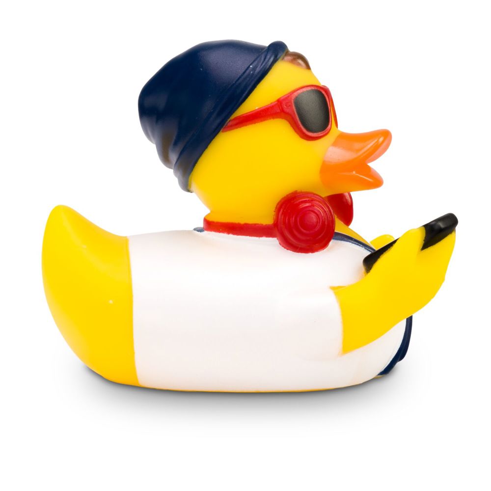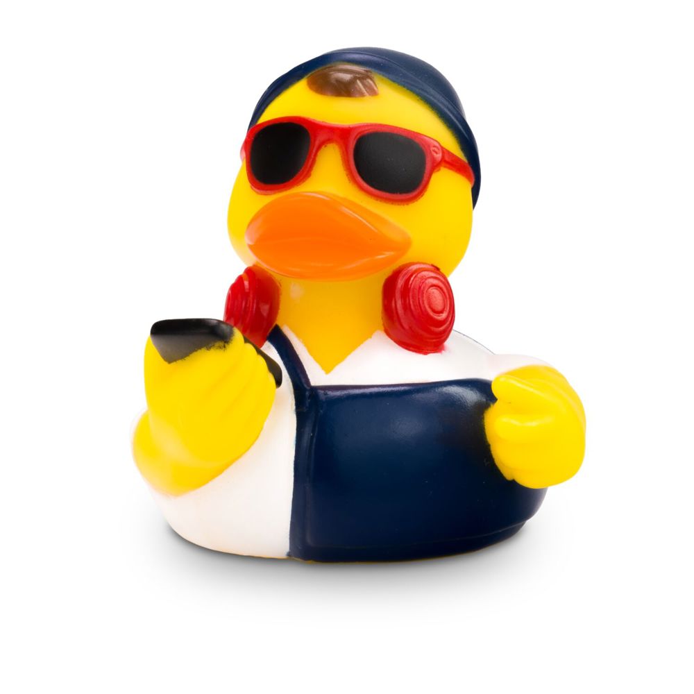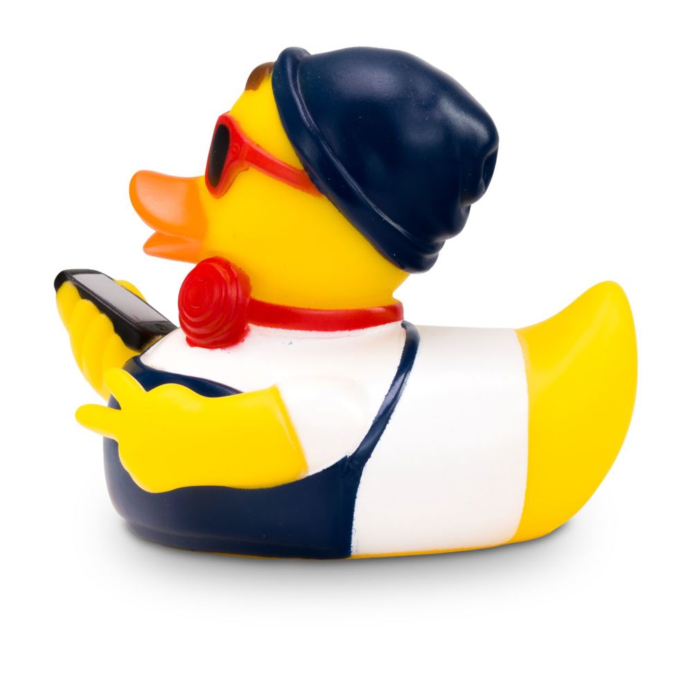Advertising duck Hannes Hipster is a modern duck. He wears a white shirt with blue dungarees and a matching blue cap. He wears red headphones around his neck, red sunglasses on his nose, and carries a brand-new smartphone in his wing. Size: approx. 8 cm. Includes squeaker valve.