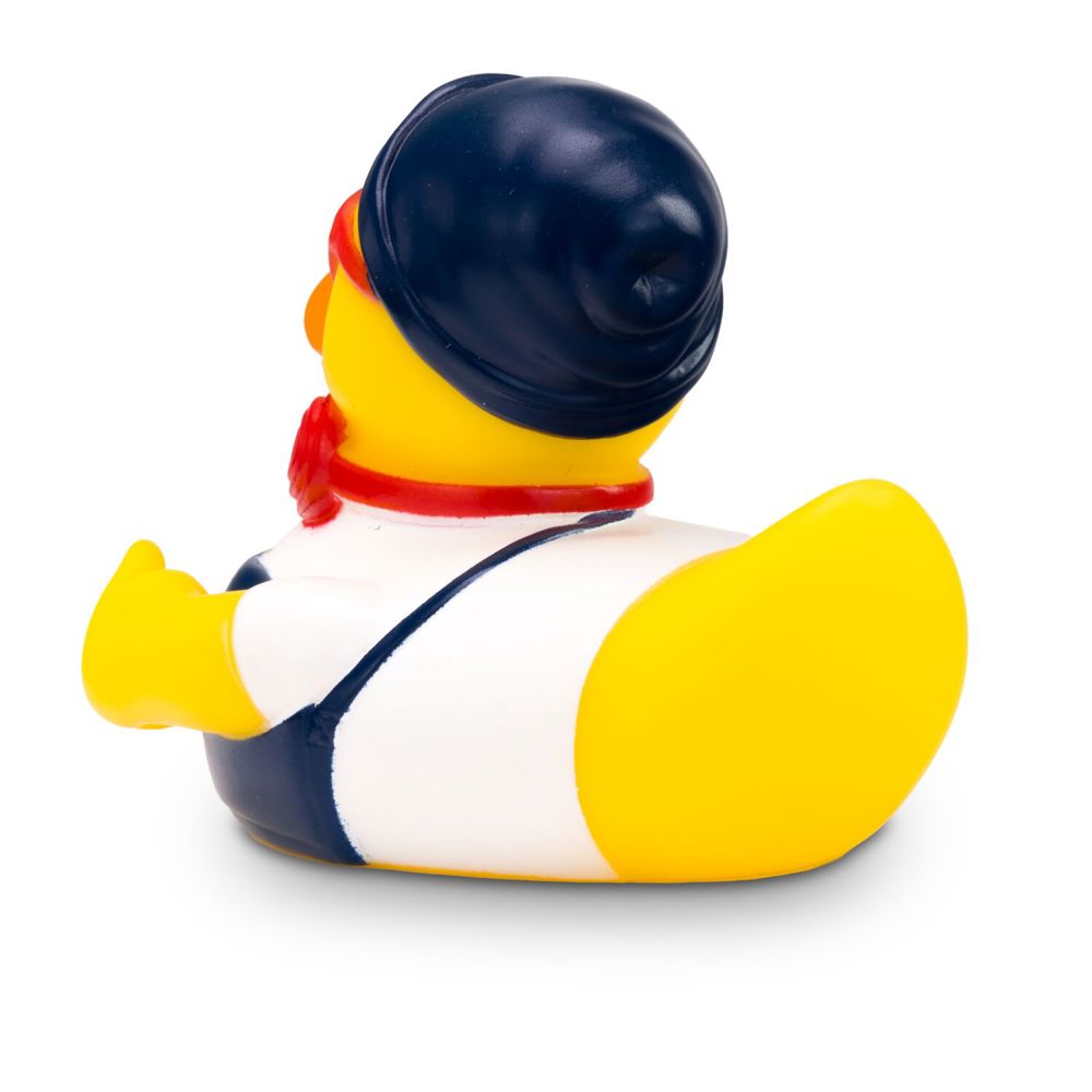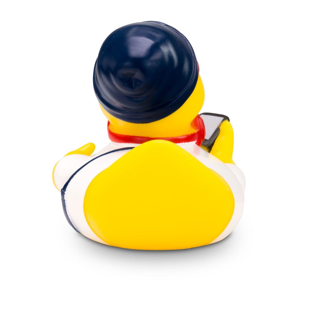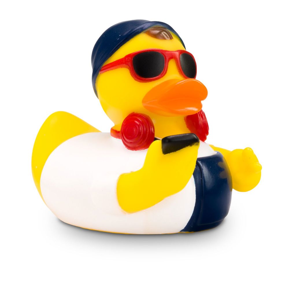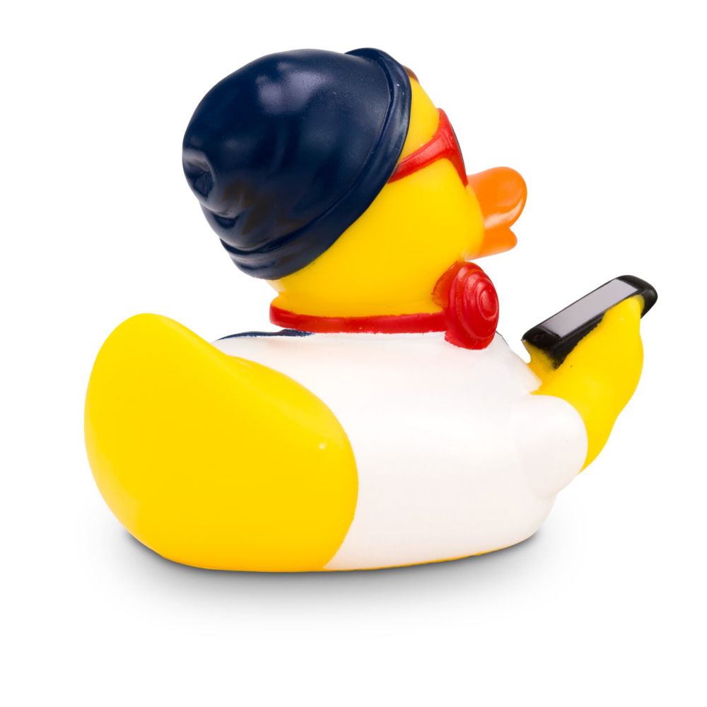 Advertising duck Hannes Hipster is a modern duck. He wears a white shirt with blue dungarees and a matching blue cap. He wears red headphones around his neck, red sunglasses on his nose, and carries a brand-new smartphone in his wing. Size: approx. 8 cm. Includes squeaker valve.