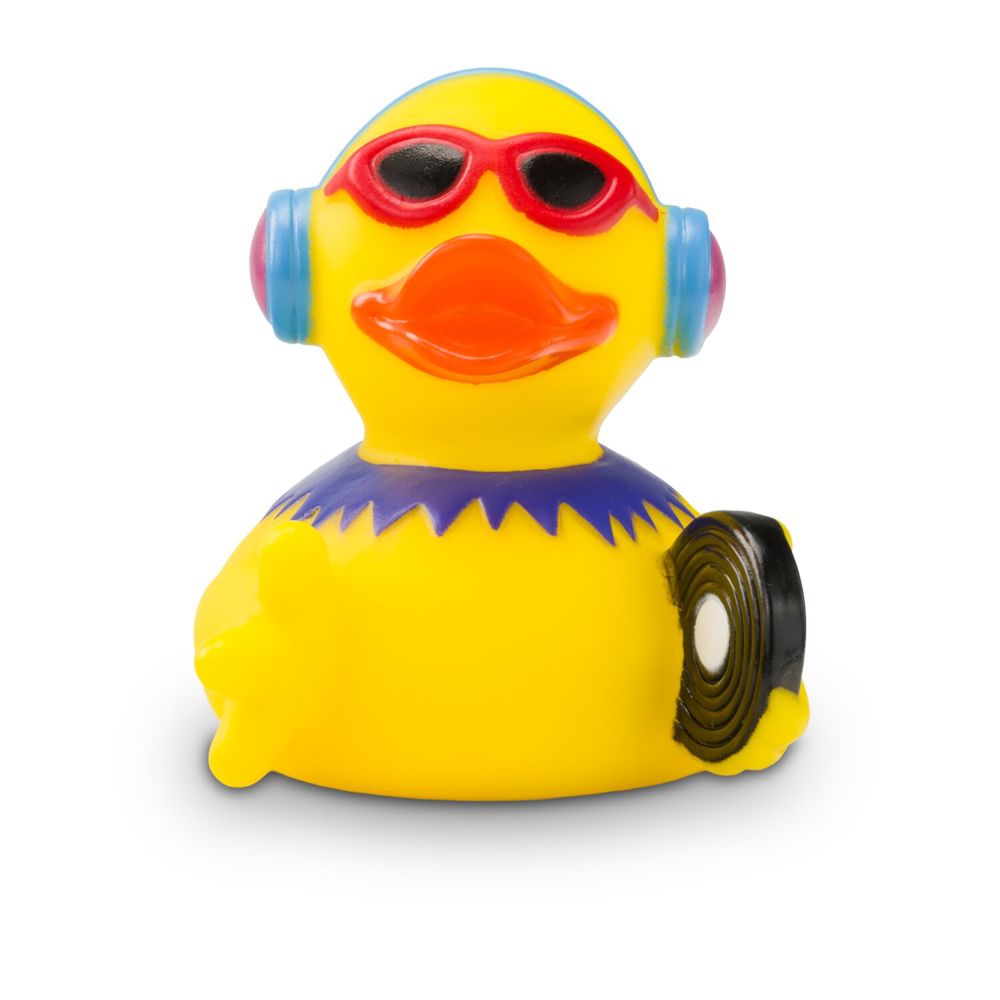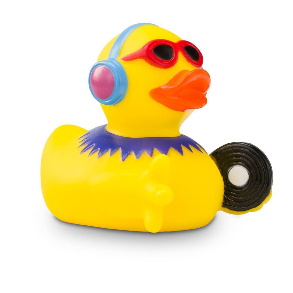 Bath duck Danny Disco is a must at every party. As a DJ, he gets the crowd going and always has the right CD and record to hand. He also looks really cool with his red sunglasses, blue headphones and purple chain. Size: approx. 8 cm. Including squeak valve