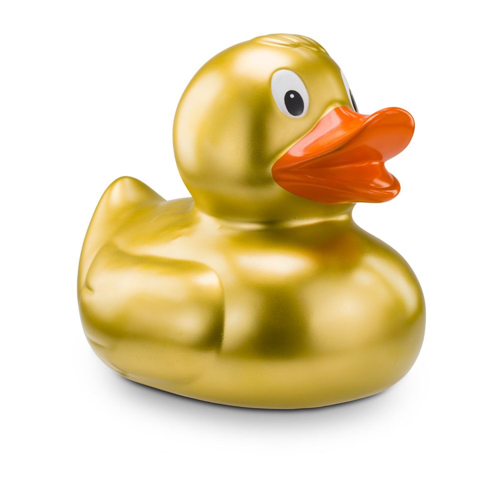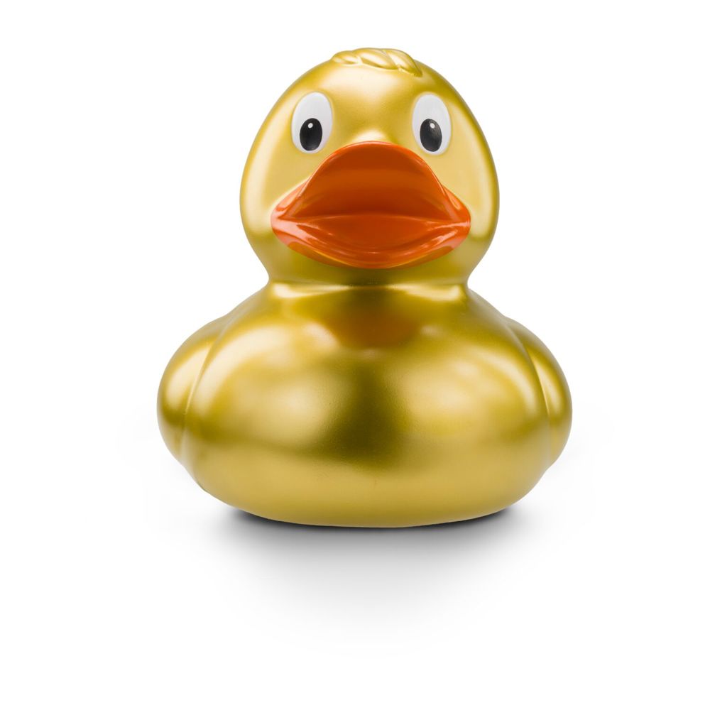 Large, luxurious, and timeless - Goldmarie XXL attracts everyone's attention with her elegant golden plumage, bright orange beak, and classic duck body. With a proud length of 30 cm, this XXL rubber duck brings golden shine to the bathroom while remaining a stylish classic. As a member of a large family, Goldmarie XXL has other siblings, also in different colors. Size: approx. 30 cm. Includes squeaker valve