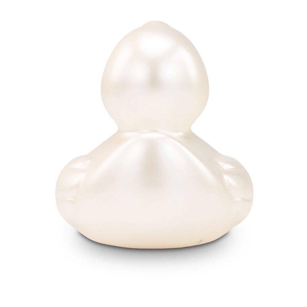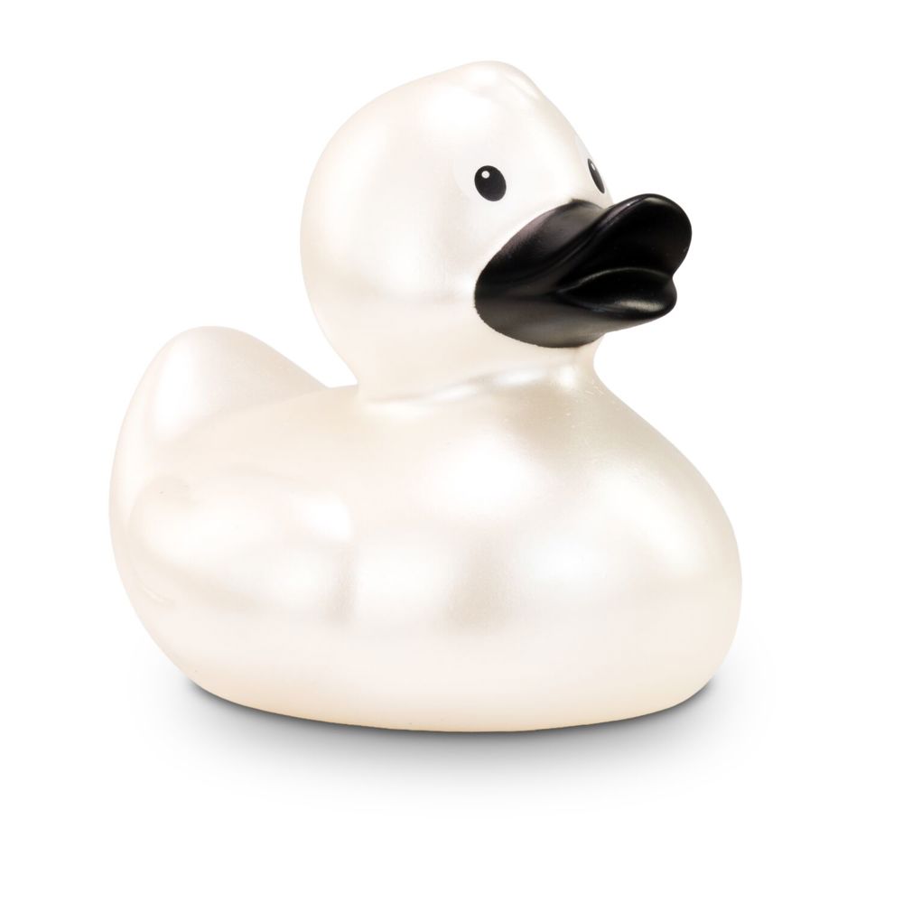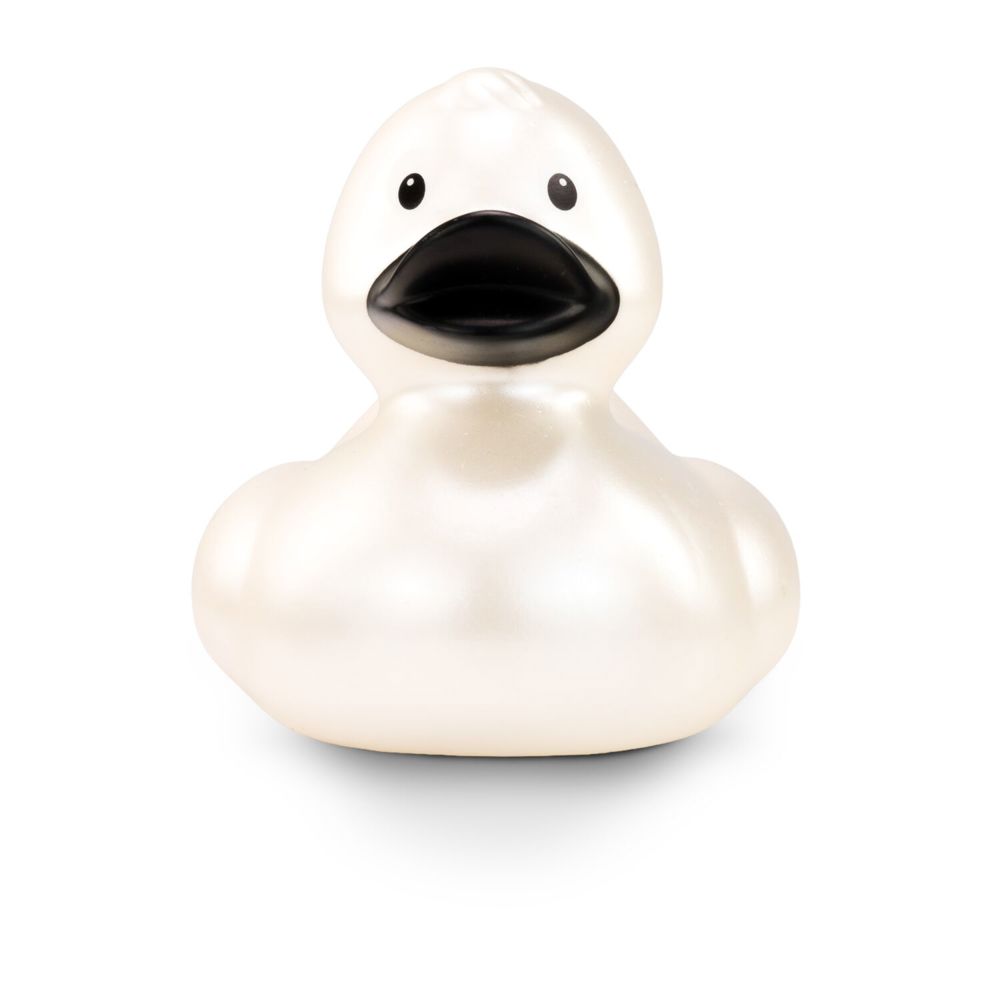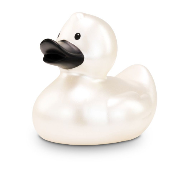 Pia Perlmutt captivates with her dazzling, iridescent shine. She proudly wears a pearlescent plumage and an elegant black beak. As a timeless beauty, she attracts the envy of many female ducks. With her shapely, timeless body, she is a rubber duck classic. She has many big and little siblings, also in other colors. Size: approx. 8 cm. Includes squeaker valve.
