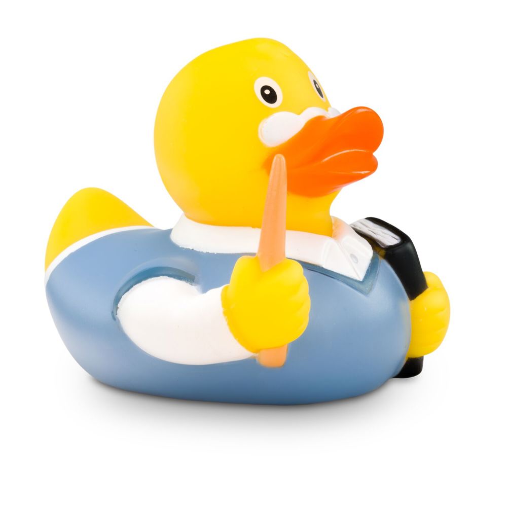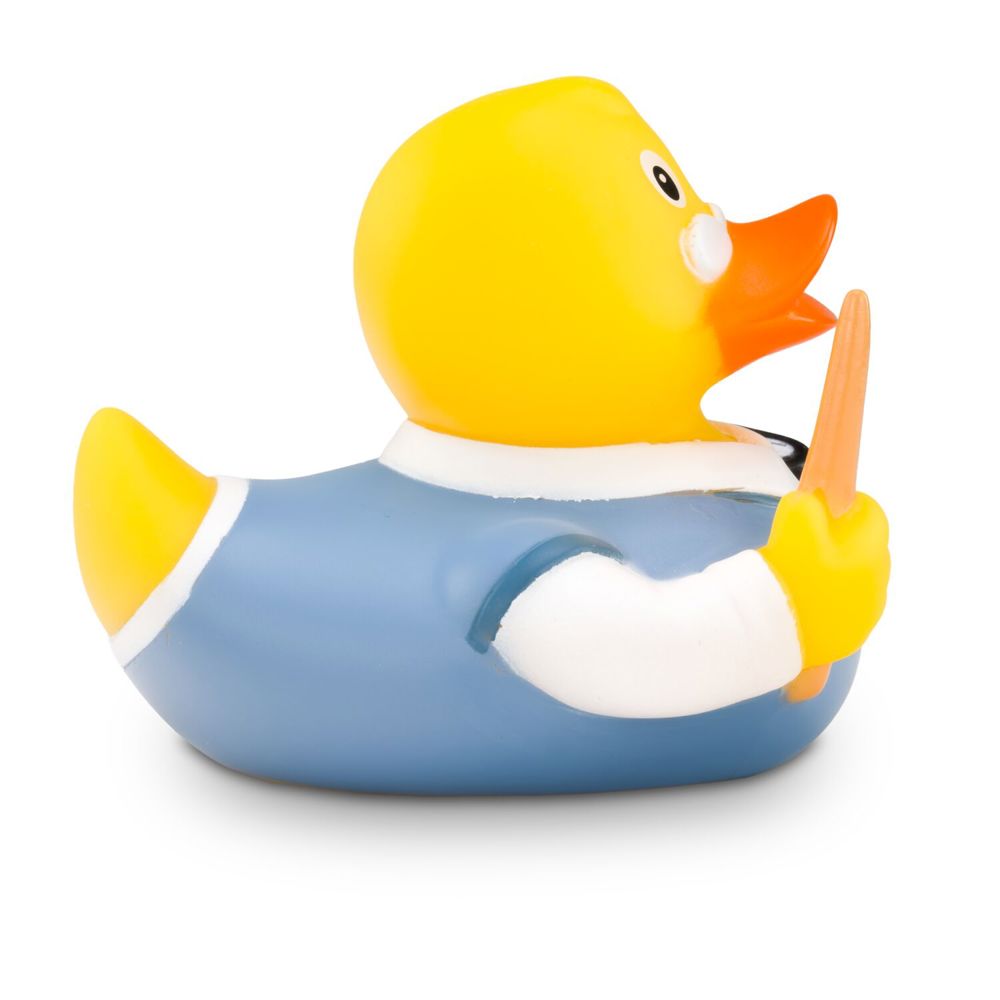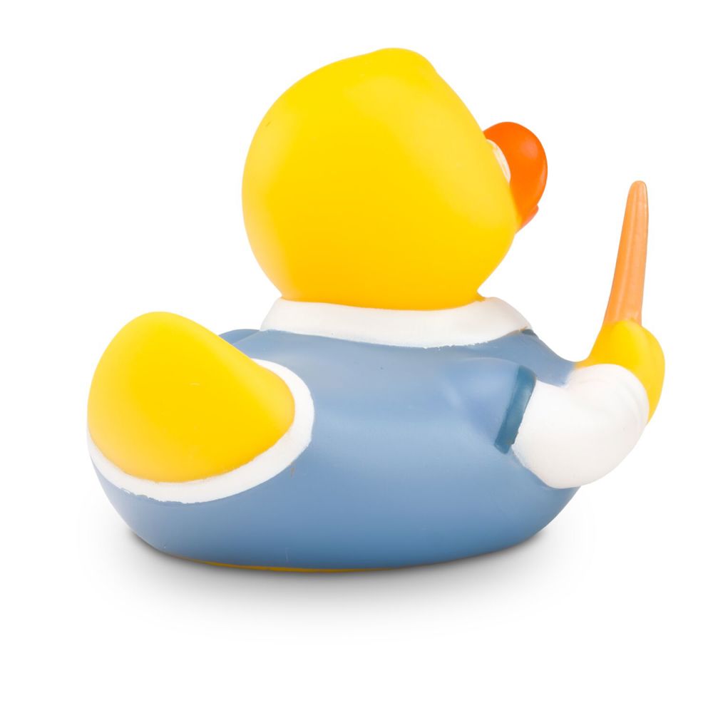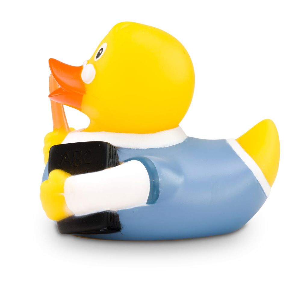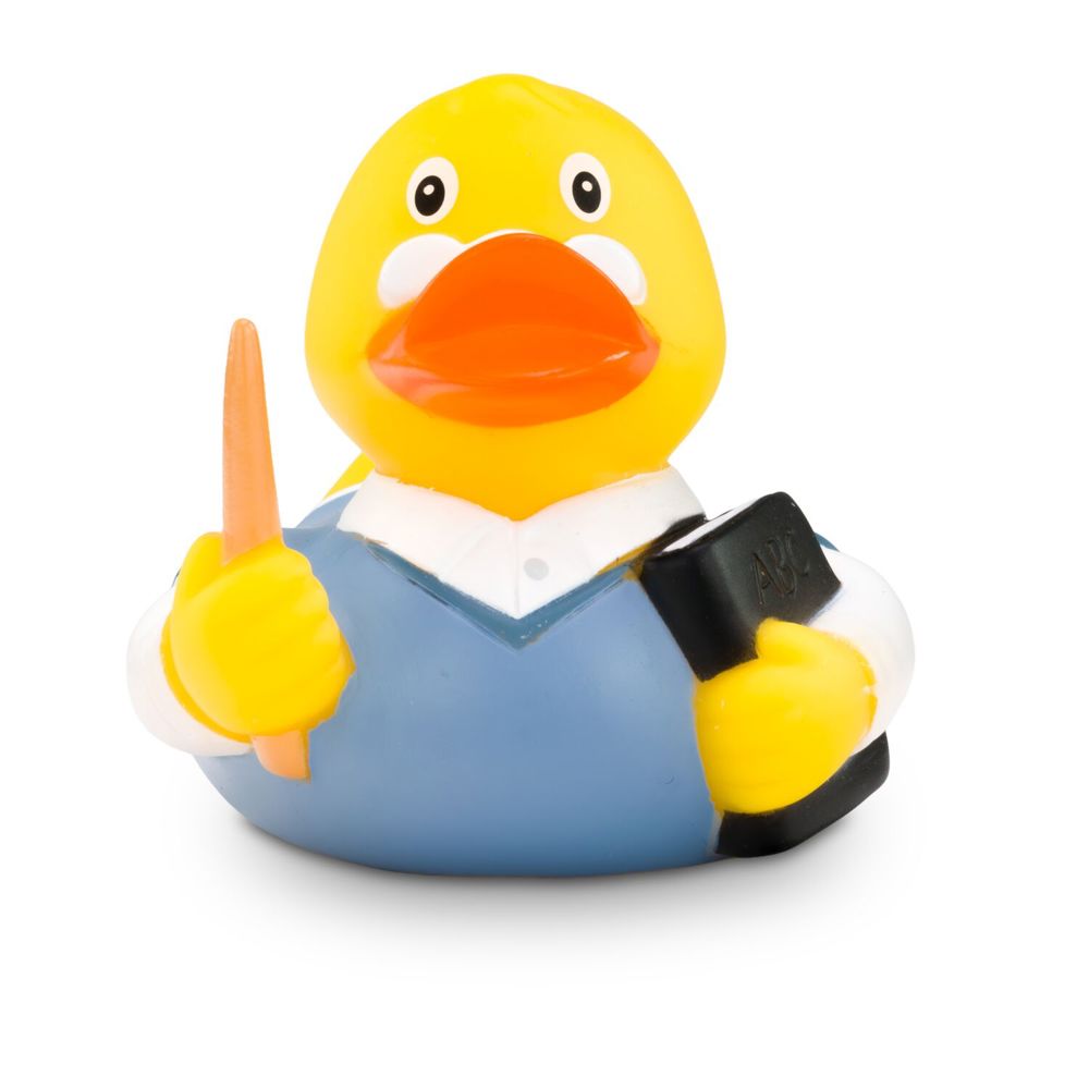 Leo teacher is the favorite teacher of all children at the duck school. He looks very stern with his classic glasses, blue top, white shirt collar, textbook and pointer. However, he passes on his generation's knowledge of the duck pond to the ducklings with lots of charm and patience. Size: approx. 8 cm. Squeak valve included