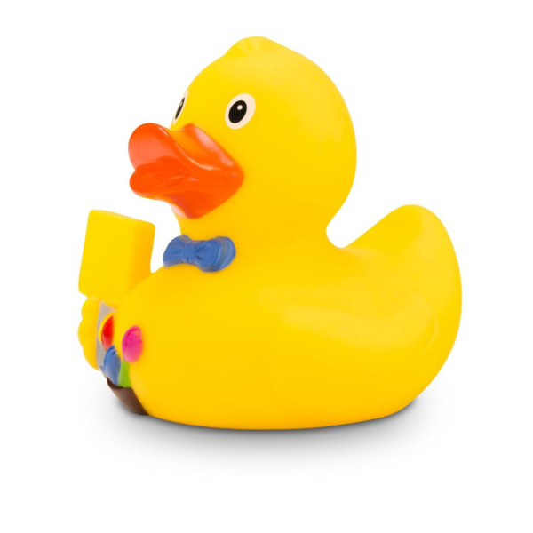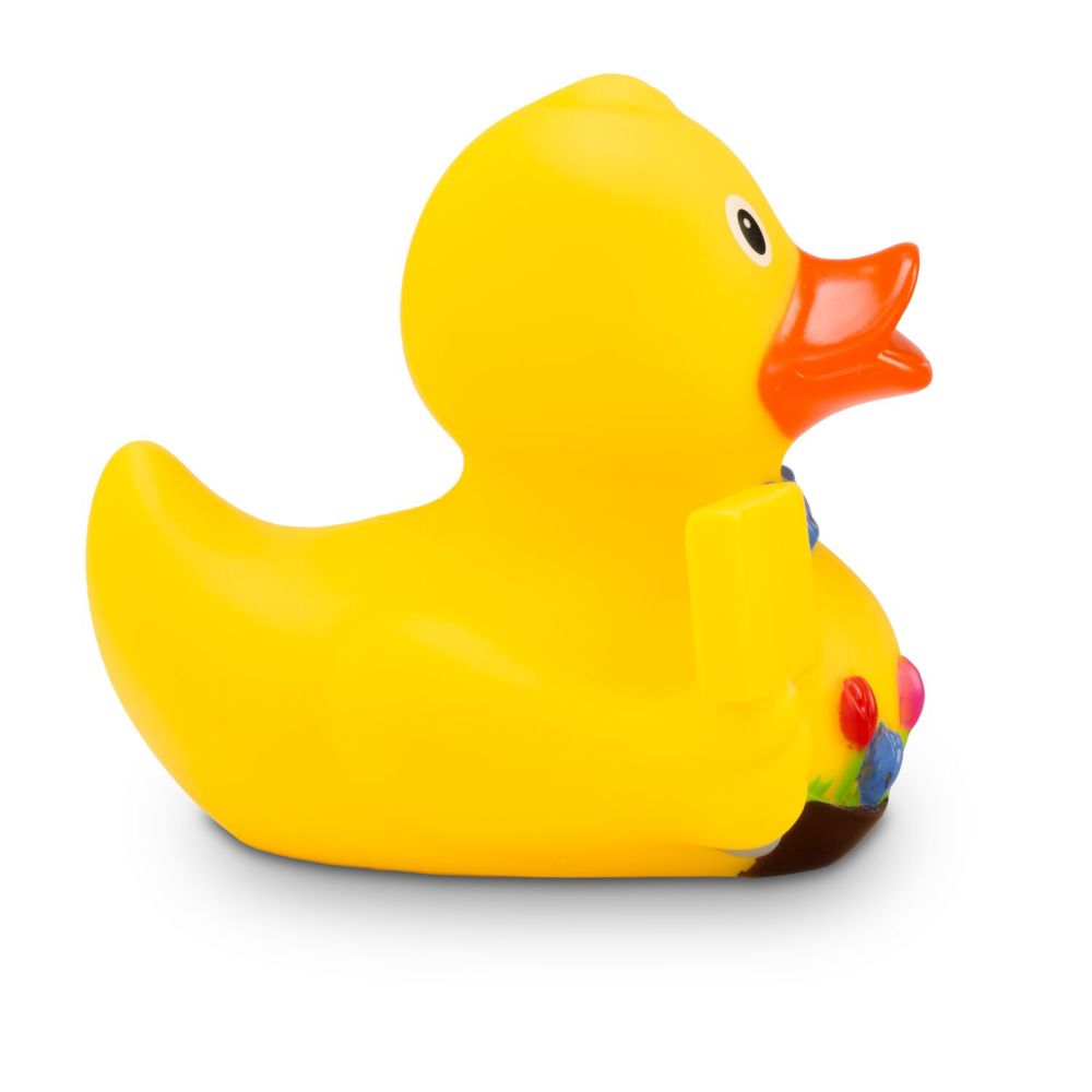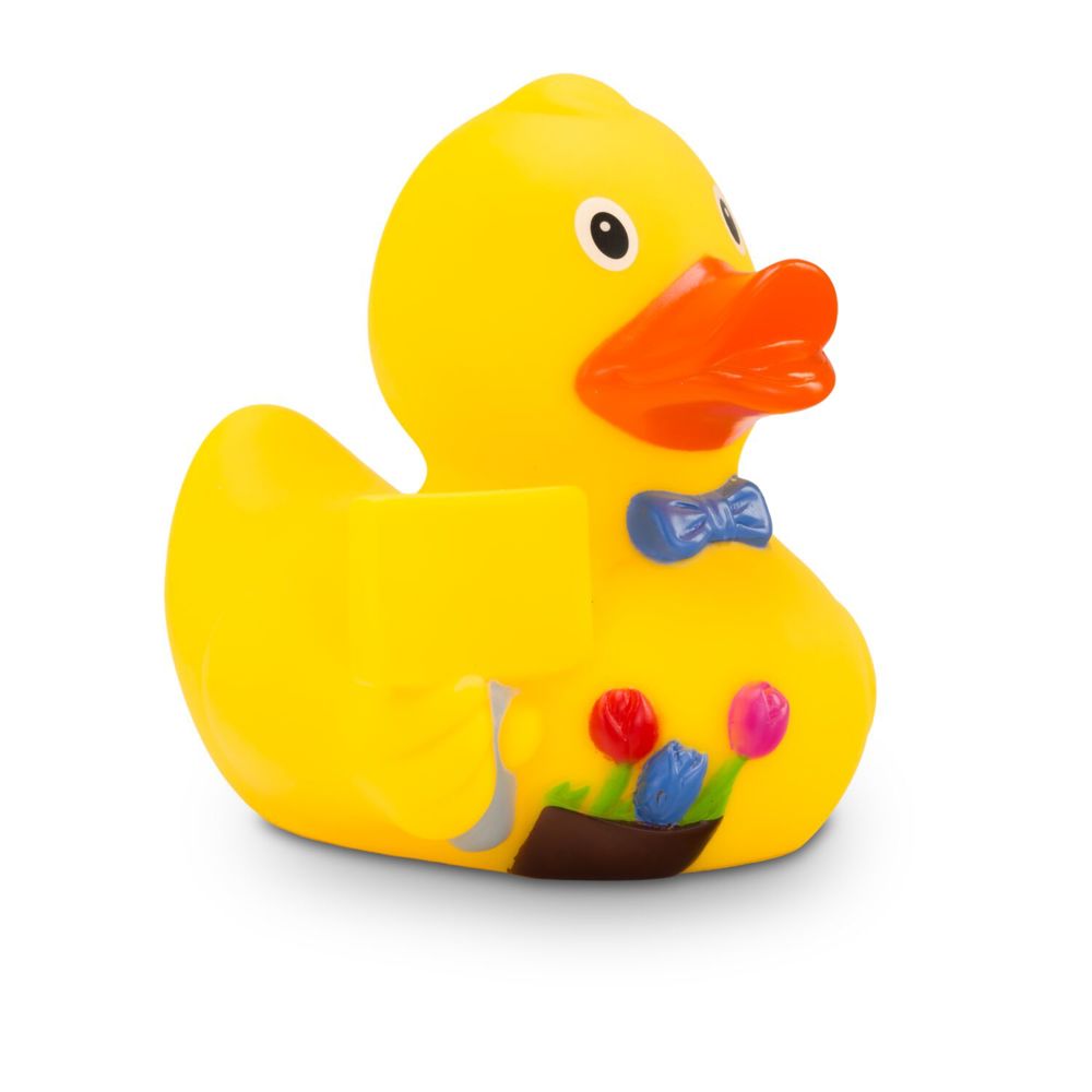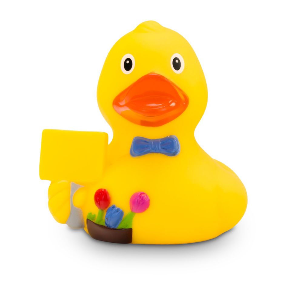 Oli Ortsschild is usually found at the beginning and end of a town. He holds up a sign with, for example, a place name, a logo, or other information printed on it. The classic yellow rubber duck wears a blue bow tie for the occasion and carries a few flowers. Ideal for cities, towns, and small villages, or as a rubber duck with a message for many occasions. Size: approx. 8 cm. Includes squeaker.