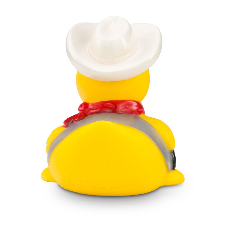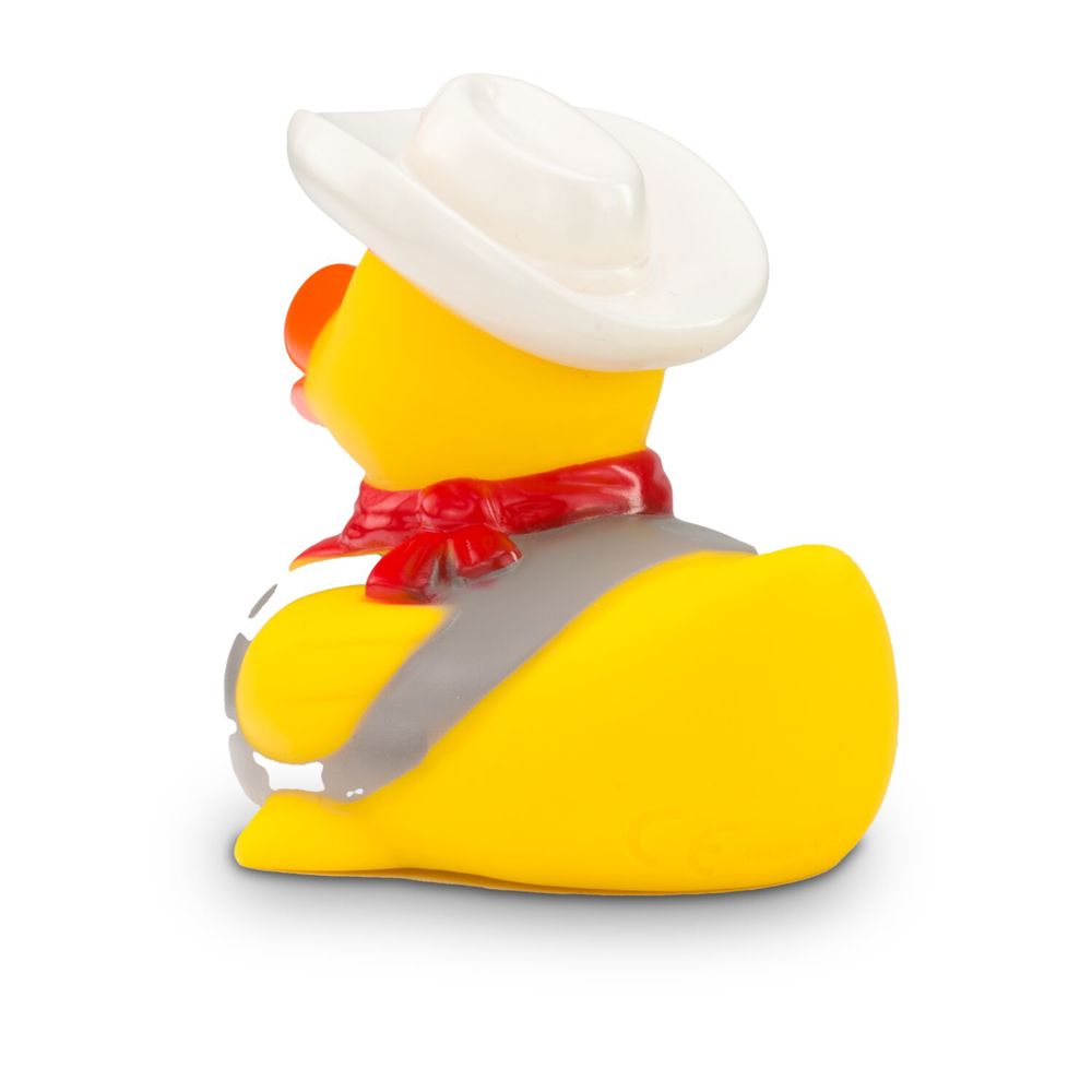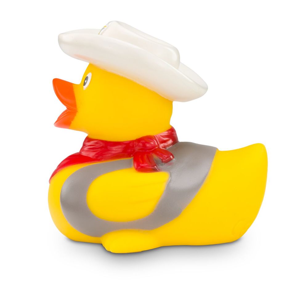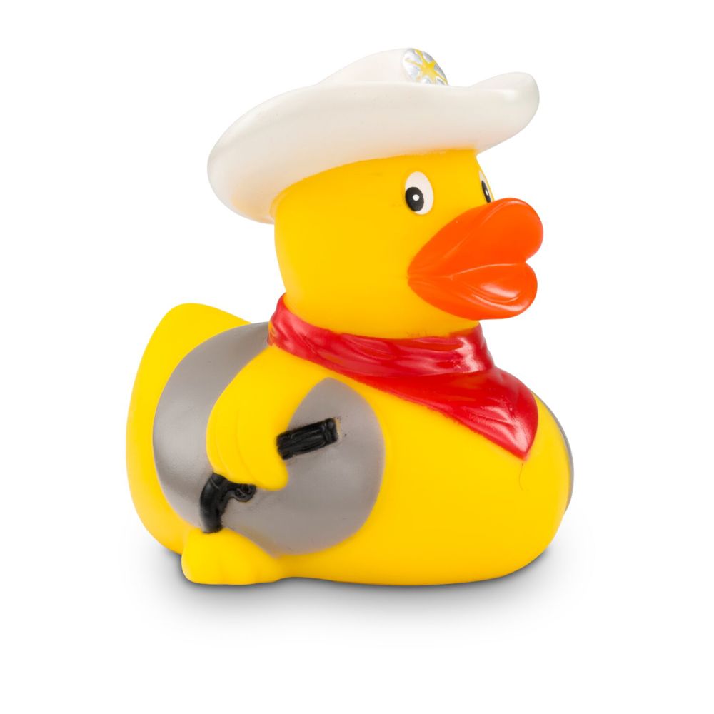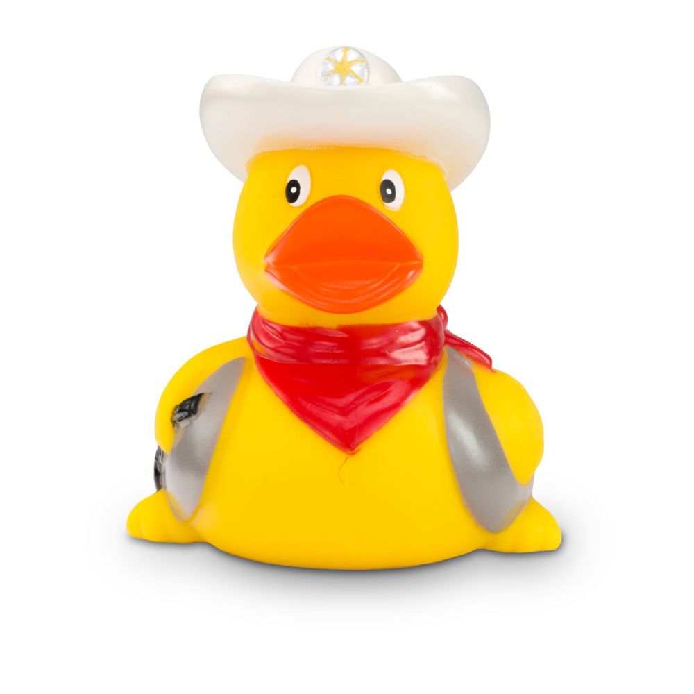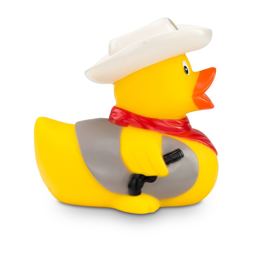 There's a new sheriff in the duck pond! Colin Colt ensures order and justice. With his white cowboy hat and red bandana, he looks like a duck from the Wild West. His pistol and vest complete the outfit. Who pulls faster? This duck is ideal as a gift for true cowboys. Size: approx. 8 cm. Squeak valve included