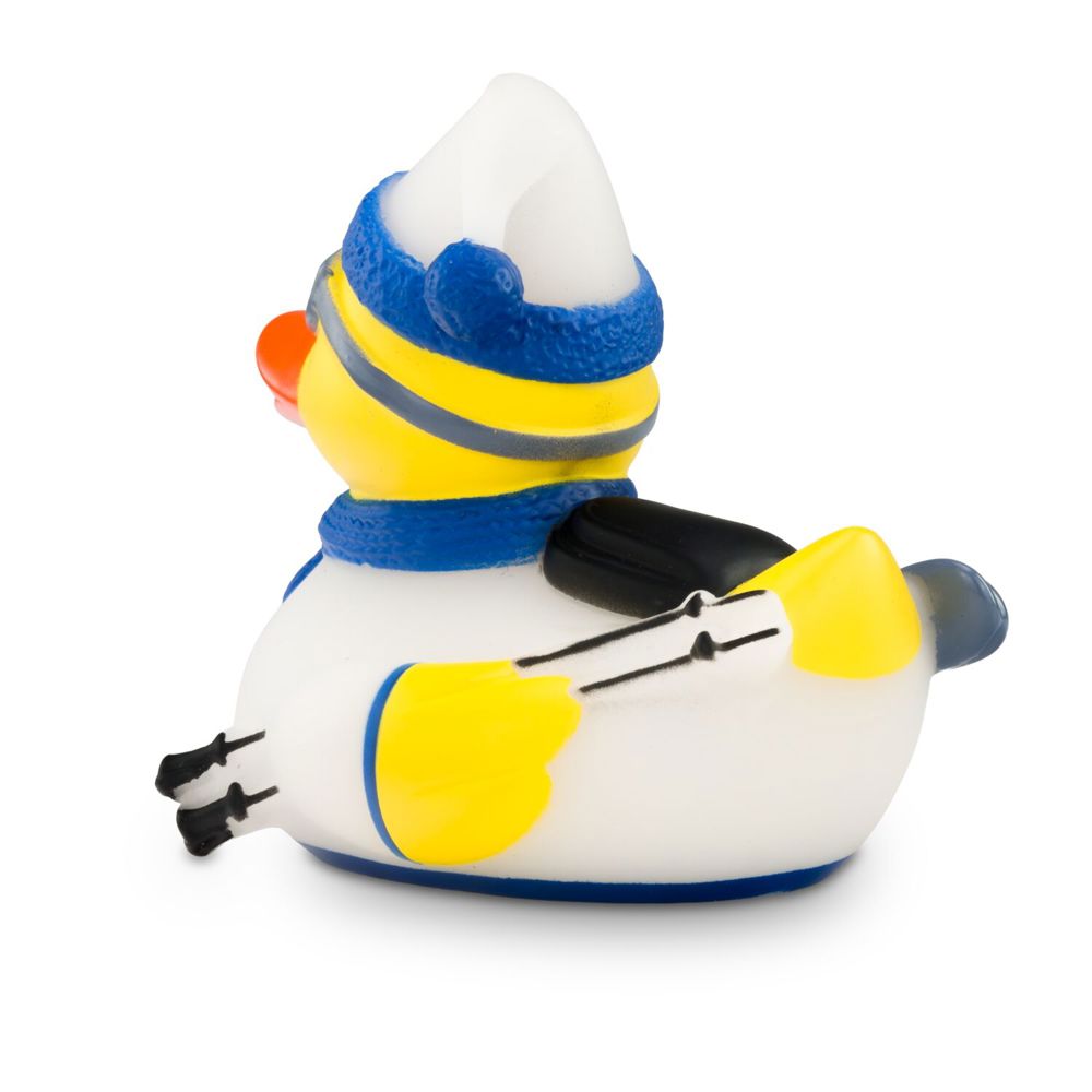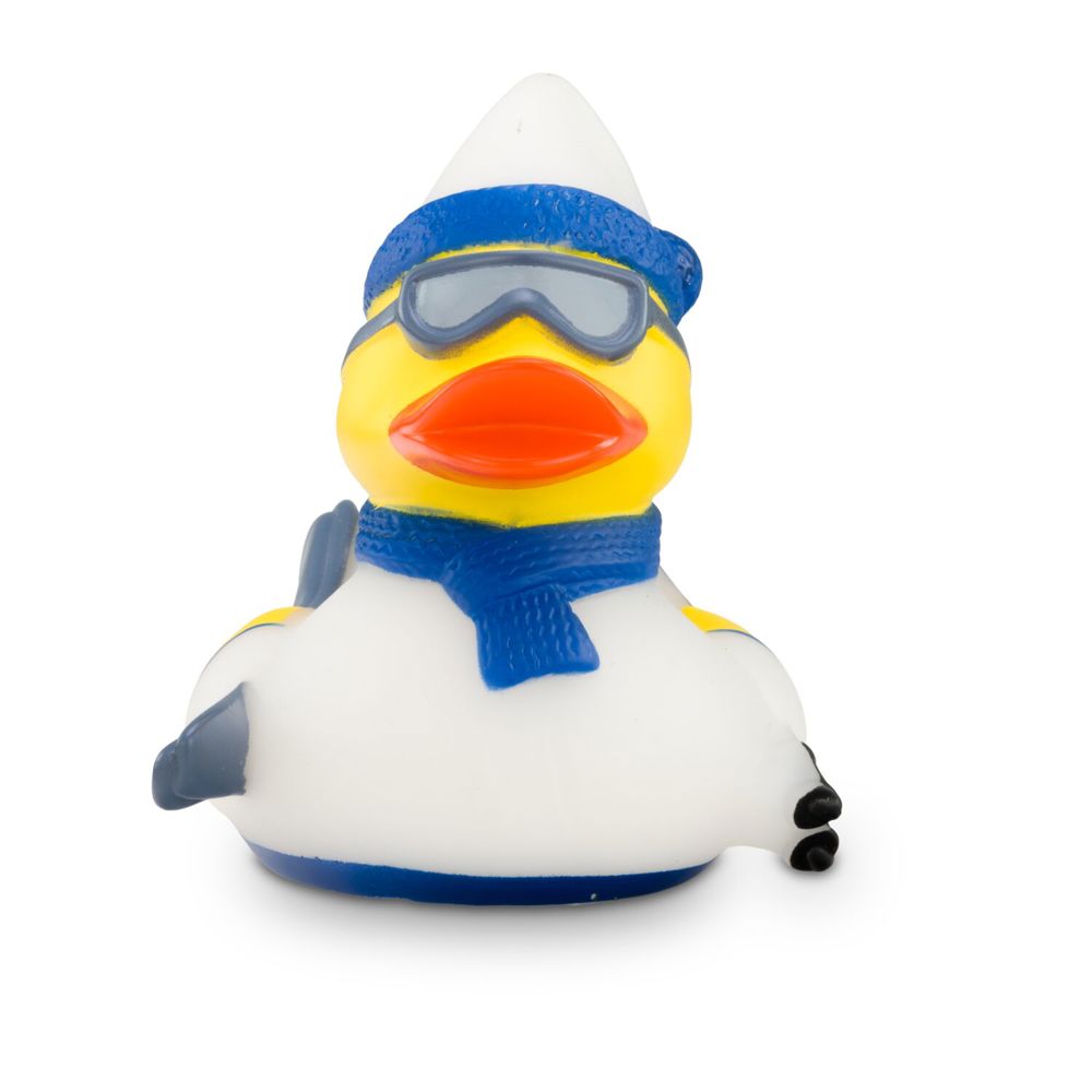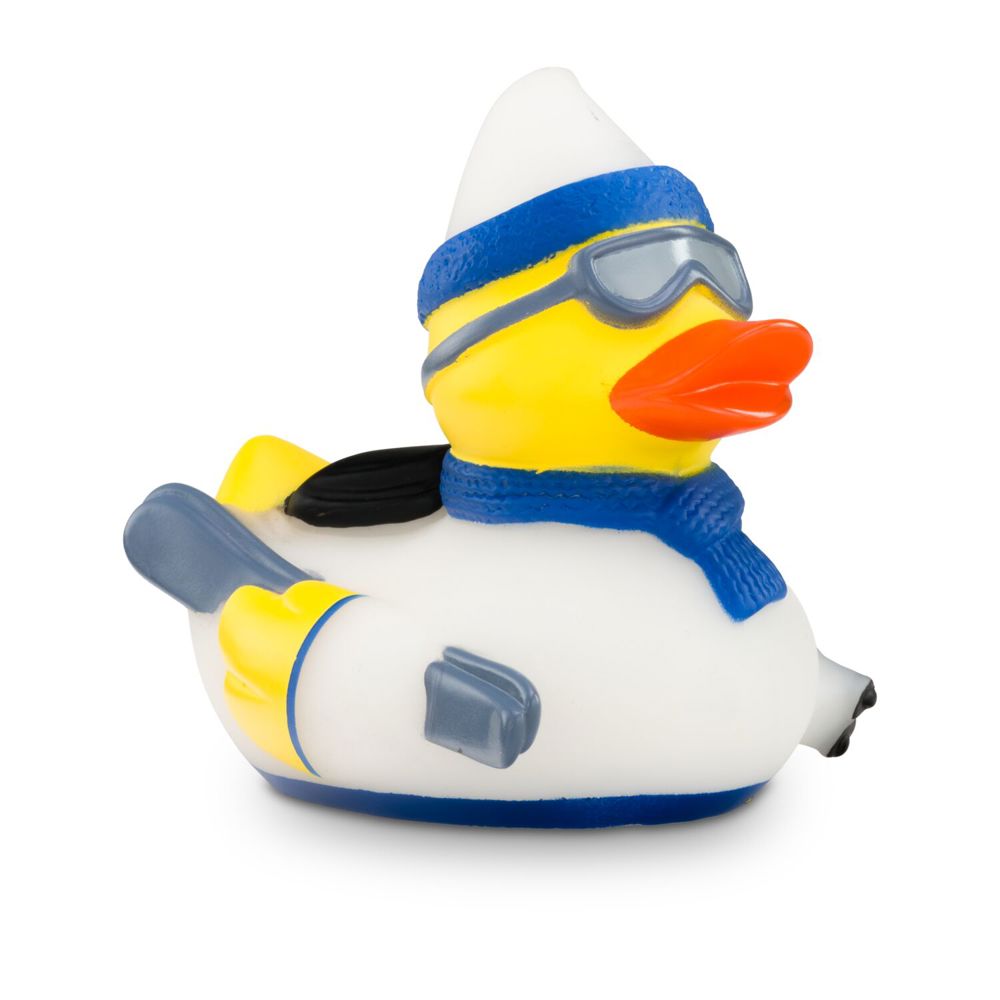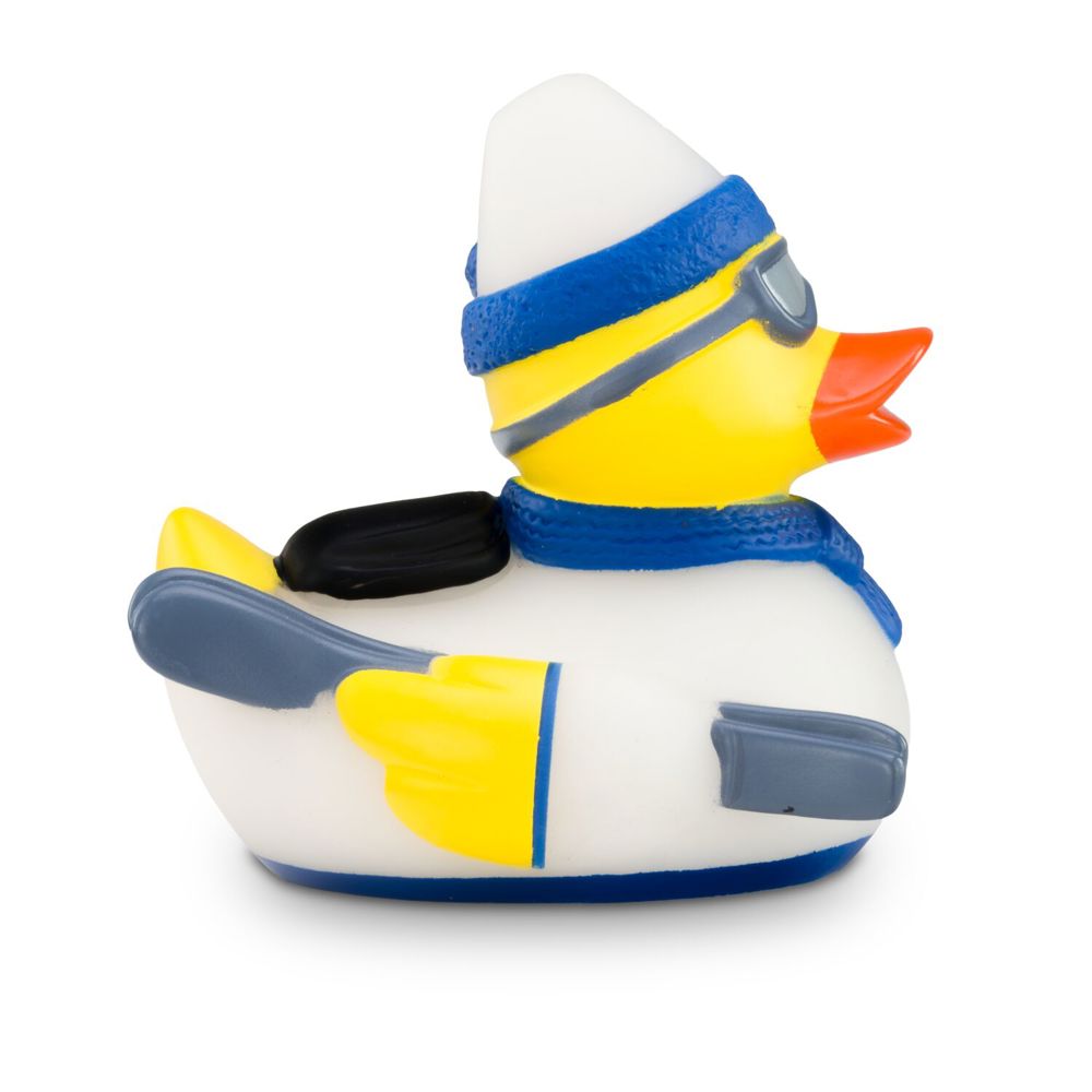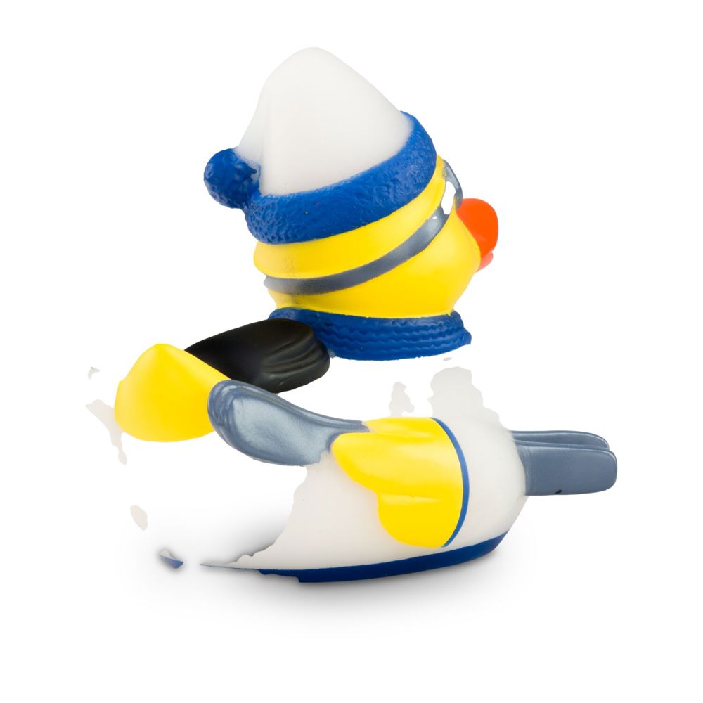 Timo Tiefschnee is a winter sports enthusiast with heart and soul. He loves skiing. When it's cold and he can whizz down the slopes, he's the happiest duck in the pond! With his white ski suit, matching hat, cool ski goggles, a blue scarf and a rucksack on his back, he is perfectly equipped for a long day's skiing. He skilfully carries his skis under his wing. Size: approx. 8 cm. Squeak valve included