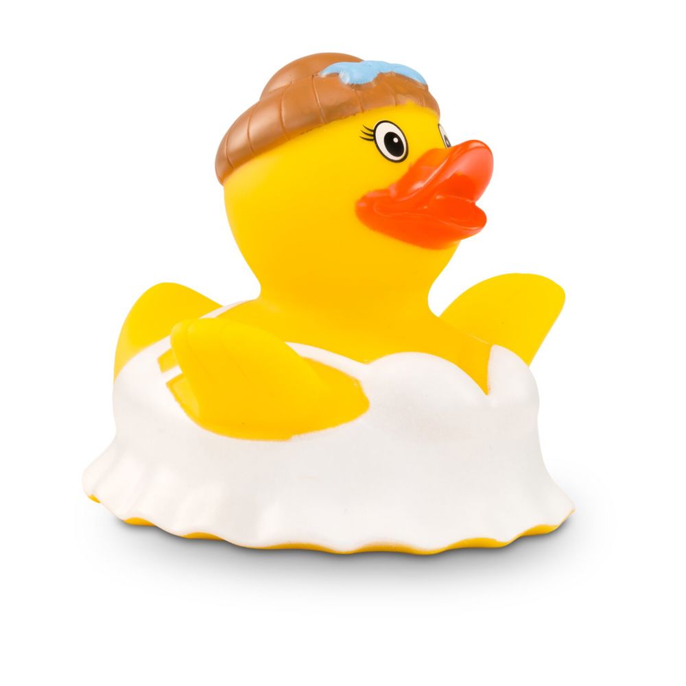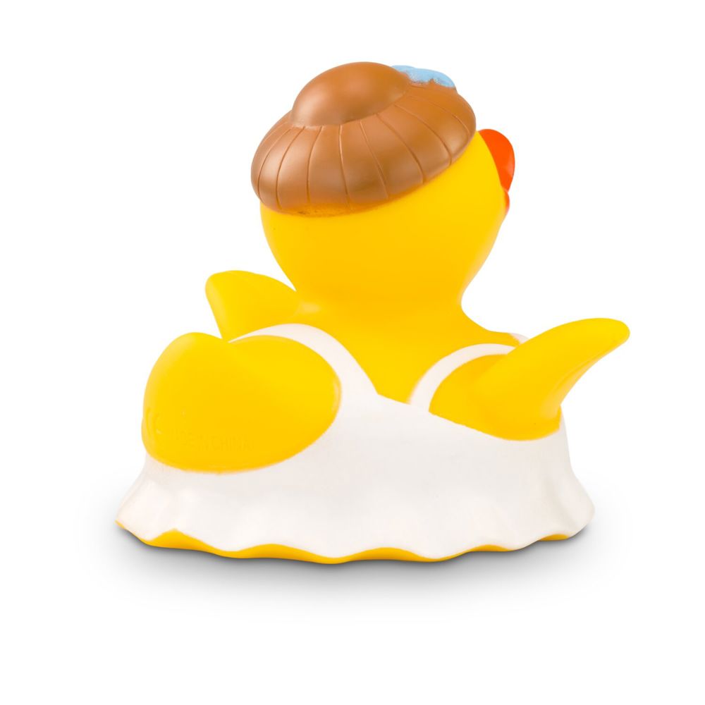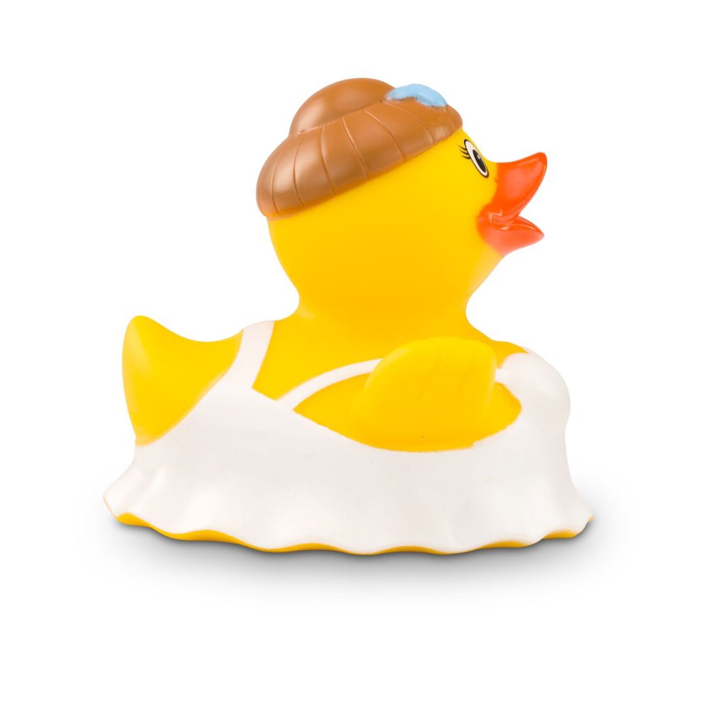 Bella Ballerina would like to become a professional ballet dancer. Until then, she dances elegantly through the duck pond in her white dress, lifting her two wings into the air. Her eyelashes are discreetly made up and she wears a blue bow in her pinned-up hair to look perfect for the next dance. Size: approx. 8 cm. Including squeaky valve
